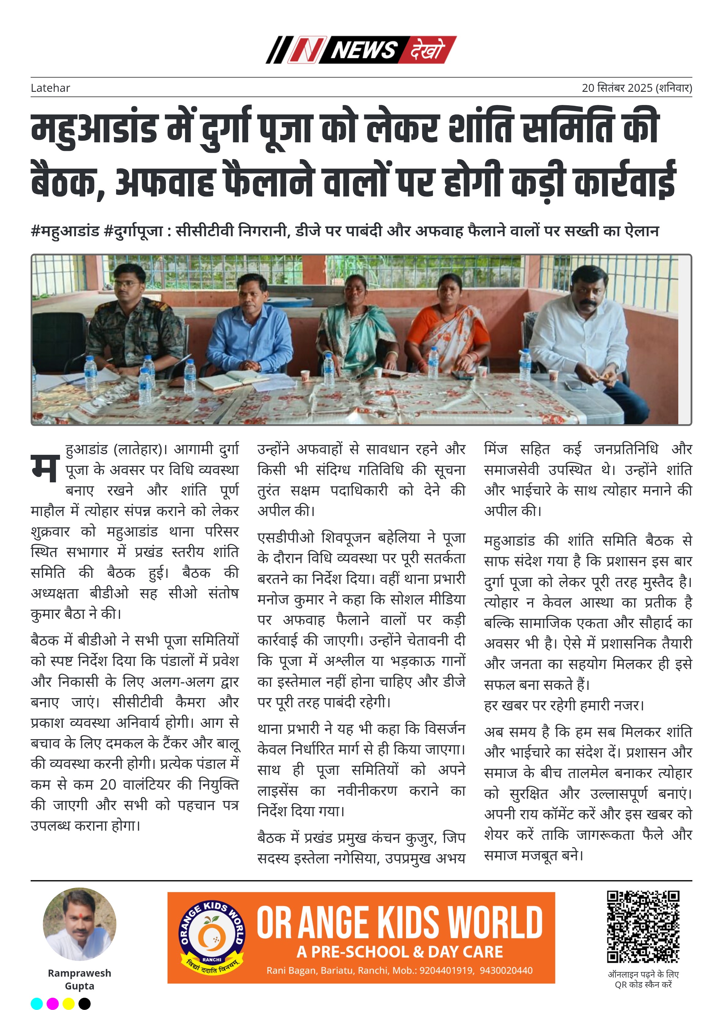 #महुआडांड #दुर्गापूजा : सीसीटीवी निगरानी, डीजे पर पाबंदी और अफवाह फैलाने वालों पर सख्ती का ऐलान महुआडांड बीडीओ सह सीओ संतोष कुमार बैठा की अध्यक्षता में शांति समिति की बैठक हुई। दुर्गा पूजा पंडालों में सीसीटीवी, लाइट, दमकल और वालंटियर की व्यवस्था अनिवार्य। असमाजिक तत्व और सोशल मीडिया पर अफवाह फैलाने वाले होंगे कड़ी कार्रवाई के दायरे में। पूजा समितियों को डीजे पर पूर्ण पाबंदी और भड़काऊ गानों से परहेज का निर्देश। विसर्जन निर्धारित मार्ग से ही किया जाएगा, पंडालों…
