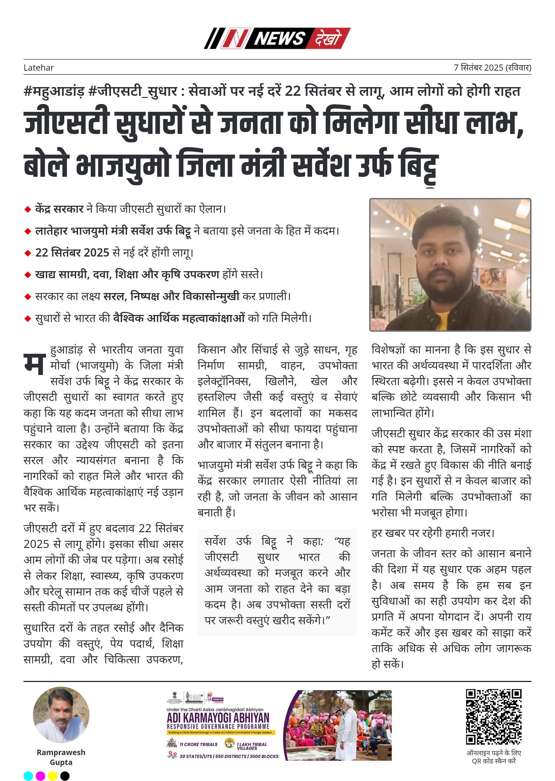 जीएसटी सुधारों से जनता को मिलेगा सीधा लाभ, बोले भाजयुमो जिला मंत्री सर्वेश उर्फ बिट्टू