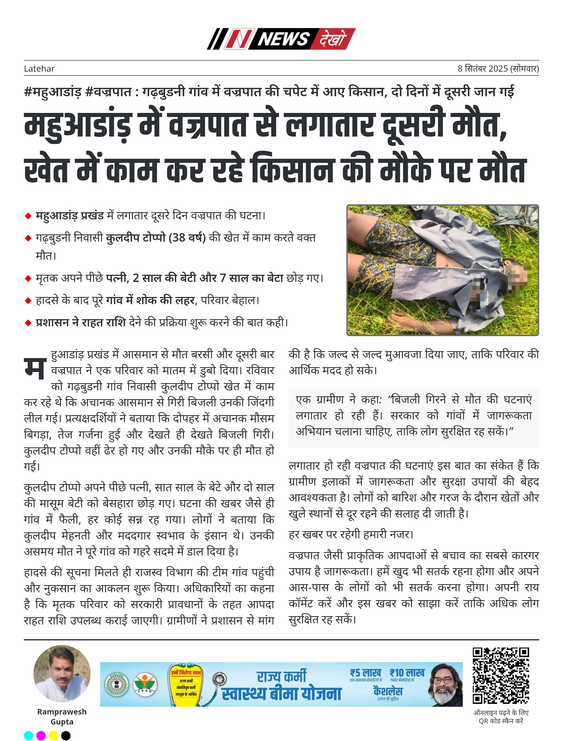 #महुआडांड़ #वज्रपात : गढ़बुडनी गांव में वज्रपात की चपेट में आए किसान, दो दिनों में दूसरी जान गई महुआडांड़ प्रखंड में लगातार दूसरे दिन वज्रपात की घटना। गढ़बुडनी निवासी कुलदीप टोप्पो (38 वर्ष) की खेत में काम करते वक्त मौत। मृतक अपने पीछे पत्नी, 2 साल की बेटी और 7 साल का बेटा छोड़ गए। हादसे के बाद पूरे गांव में शोक की लहर, परिवार बेहाल। प्रशासन ने राहत राशि देने की प्रक्रिया शुरू करने की बात कही। महुआडांड़ प्रखंड…