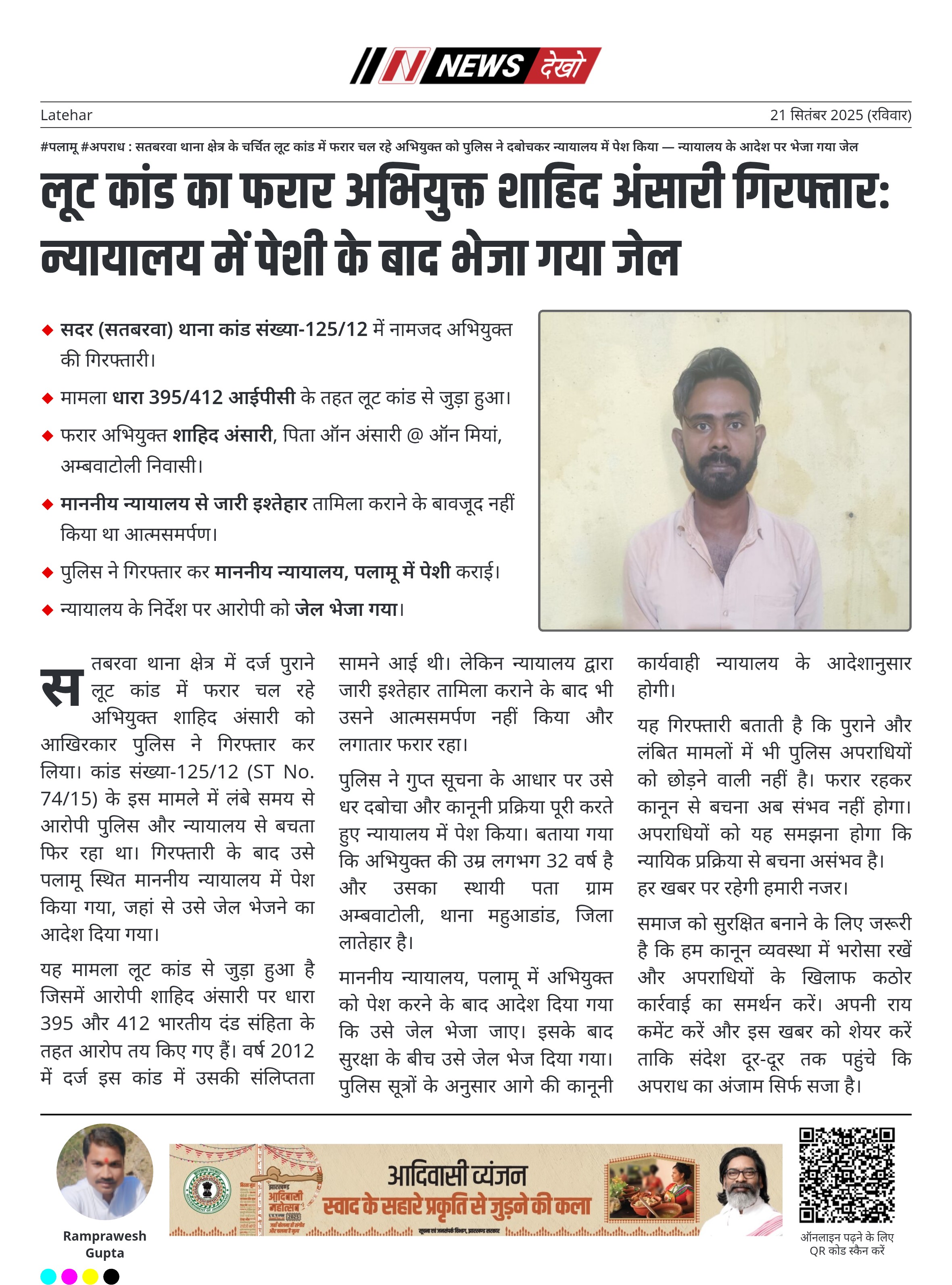 लूट कांड का फरार अभियुक्त शाहिद अंसारी गिरफ्तार: न्यायालय में पेशी के बाद भेजा गया जेल