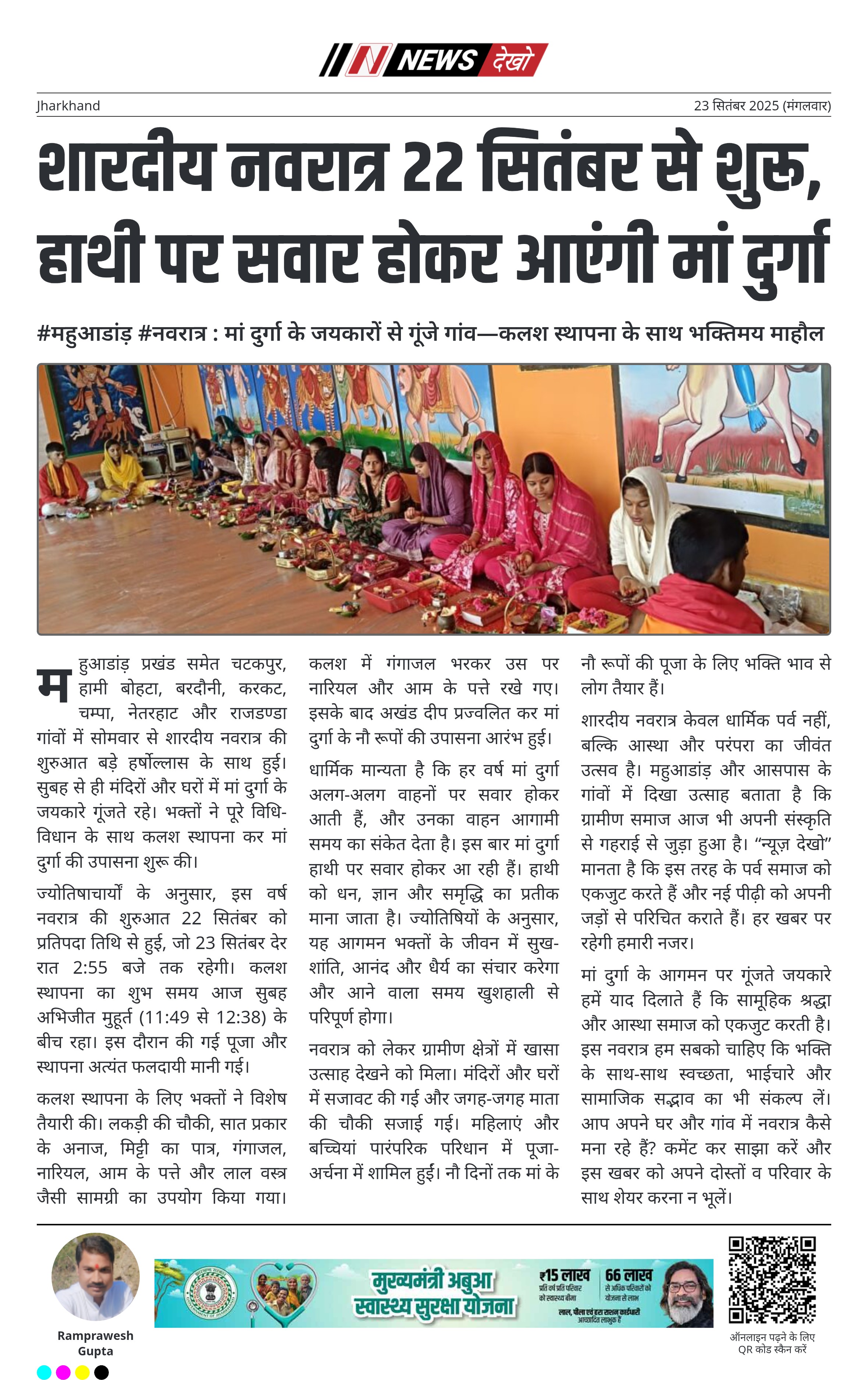 #महुआडांड़ #नवरात्र : मां दुर्गा के जयकारों से गूंजे गांव—कलश स्थापना के साथ भक्तिमय माहौल 22 सितंबर से 1 अक्टूबर तक शारदीय नवरात्र का पर्व मनाया जाएगा। इस बार मां दुर्गा हाथी पर सवार होकर आएंगी, जो समृद्धि और ज्ञान का प्रतीक है। पूरे महुआडांड़ प्रखंड और आसपास के गांव भक्तिरस में डूबे नजर आए। कलश स्थापना और घटस्थापना का शुभ मुहूर्त आज सुबह संपन्न हुआ। पूजा के लिए सामग्री और विधि पर विशेष ध्यान देकर भक्तों ने अनुष्ठान पूरे…