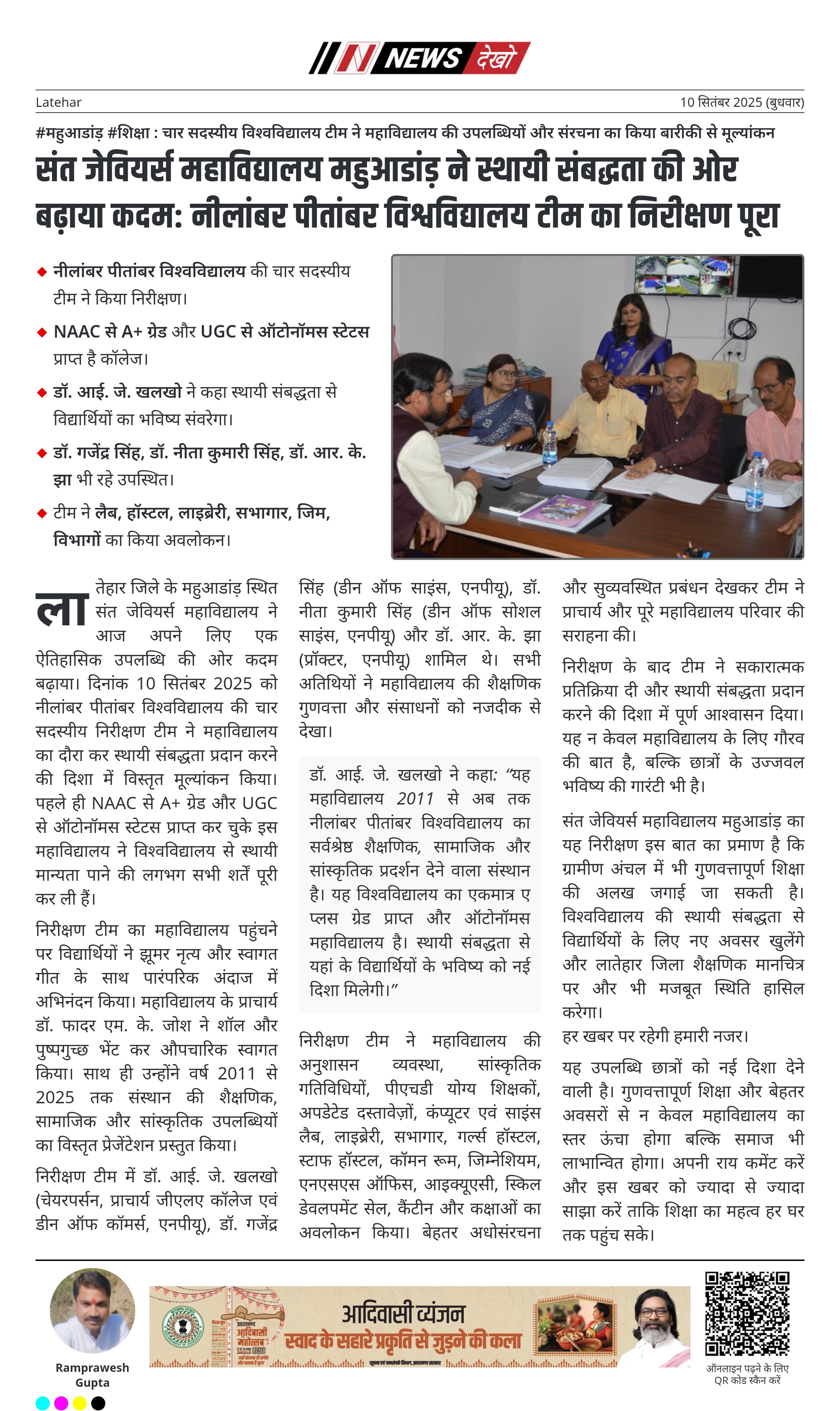 #महुआडांड़ #शिक्षा : चार सदस्यीय विश्वविद्यालय टीम ने महाविद्यालय की उपलब्धियों और संरचना का किया बारीकी से मूल्यांकन नीलांबर पीतांबर विश्वविद्यालय की चार सदस्यीय टीम ने किया निरीक्षण। NAAC से A+ ग्रेड और UGC से ऑटोनॉमस स्टेटस प्राप्त है कॉलेज। डॉ. आई. जे. खलखो ने कहा स्थायी संबद्धता से विद्यार्थियों का भविष्य संवरेगा। डॉ. गजेंद्र सिंह, डॉ. नीता कुमारी सिंह, डॉ. आर. के. झा भी रहे उपस्थित। टीम ने लैब, हॉस्टल, लाइब्रेरी, सभागार, जिम, विभागों का किया अवलोकन। लातेहार जिले…