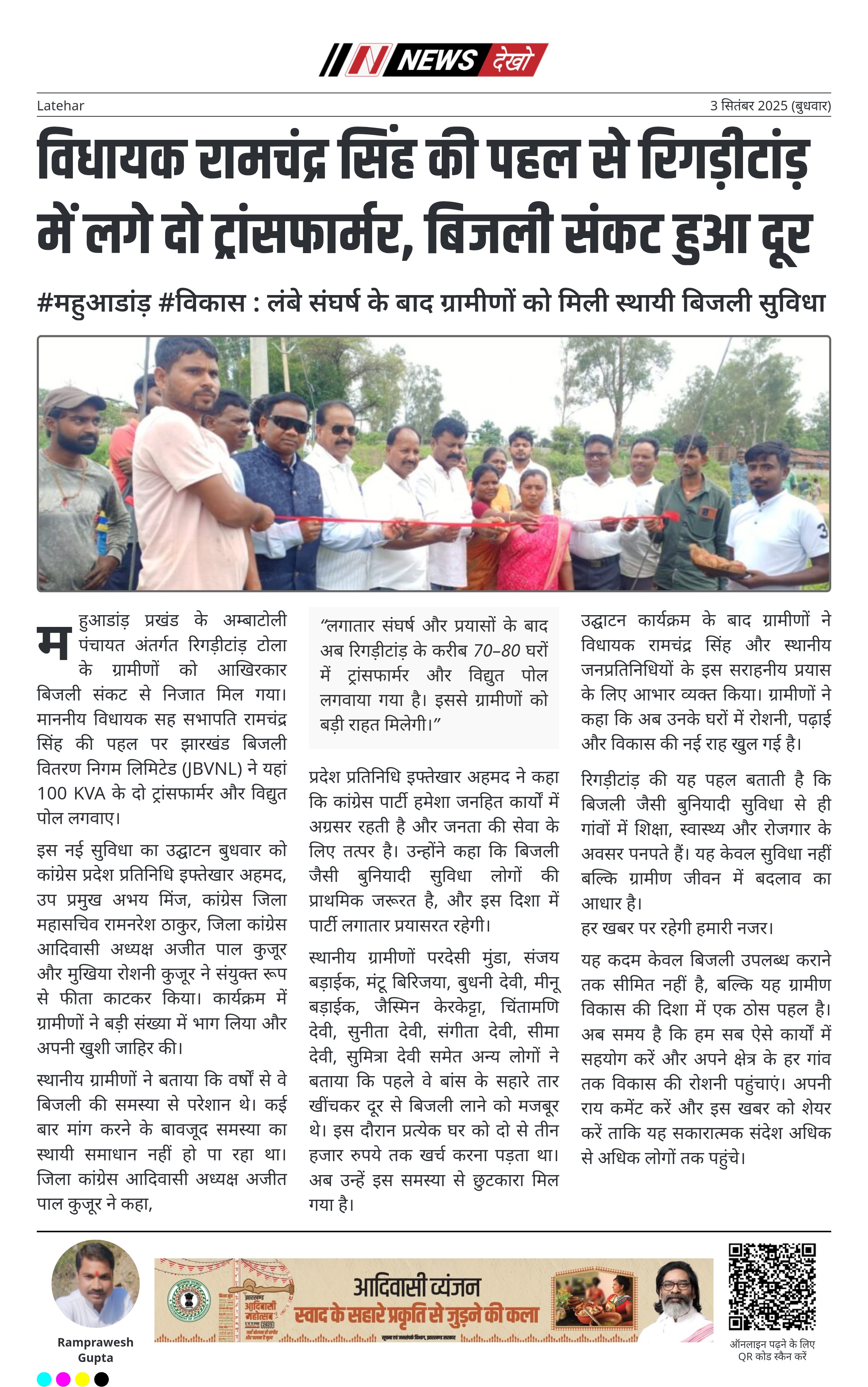 #महुआडांड़ #विकास : लंबे संघर्ष के बाद ग्रामीणों को मिली स्थायी बिजली सुविधा रिगड़ीटांड़ टोला में बिजली की समस्या का समाधान। 100 KVA के दो ट्रांसफार्मर और विद्युत पोल लगाए गए। उद्घाटन में कांग्रेस नेताओं और जनप्रतिनिधियों की मौजूदगी। ग्रामीणों को अब 70–80 घरों में नियमित बिजली आपूर्ति का लाभ। पहले ग्रामीण बांस के सहारे तार खींचकर बिजली लाने को मजबूर थे। महुआडांड़ प्रखंड के अम्बाटोली पंचायत अंतर्गत रिगड़ीटांड़ टोला के ग्रामीणों को आखिरकार बिजली संकट से निजात मिल गया।…