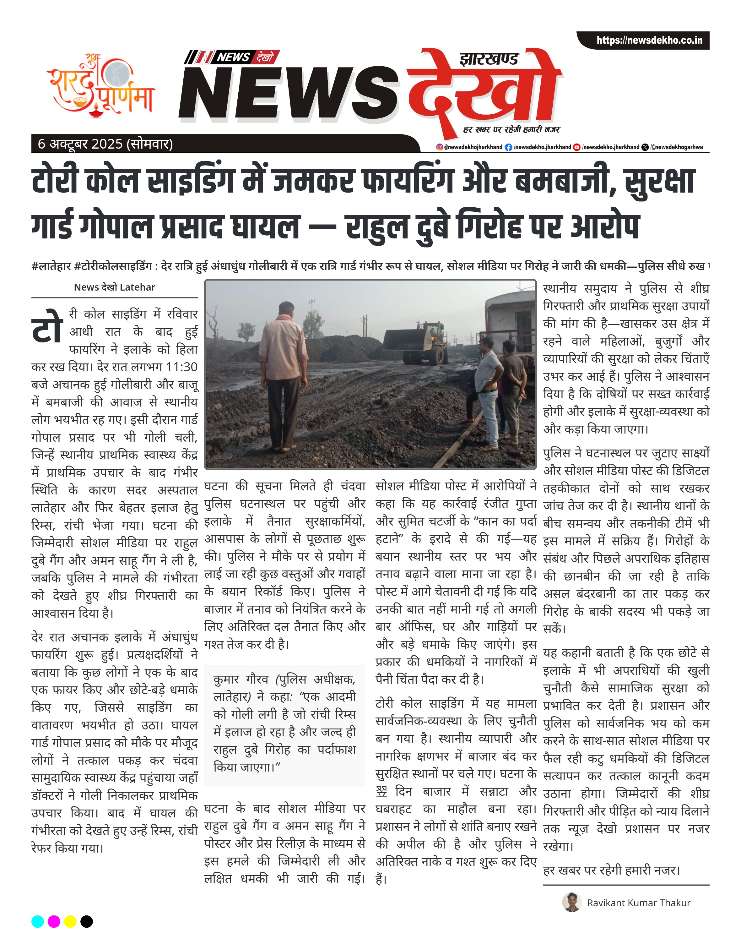#लातेहार #टोरीकोलसाइडिंग : देर रात्रि हुई अंधाधुंध गोलीबारी में एक रात्रि गार्ड गंभीर रूप से घायल, सोशल मीडिया पर गिरोह ने जारी की धमकी—पुलिस सीधे रुख पर घटना स्थान: टोरी कोल साइडिंग, चंदवा प्रखंड, देर रात लगभग 11:30 बजे हुई अंधाधुंध फायरिंग और बमबाजी।। घायल: सुरक्षा गार्ड गोपाल प्रसाद (पिता: रामकृष्ण प्रसाद, उम्र ~58 वर्ष) को गोली लगी और उनके इलाज के लिए उन्हें रिम्स, रांची रेफर किया गया।। घटना की जिम्मेदारी सोशल मीडिया पर राहुल दुबे गैंग और अमन…