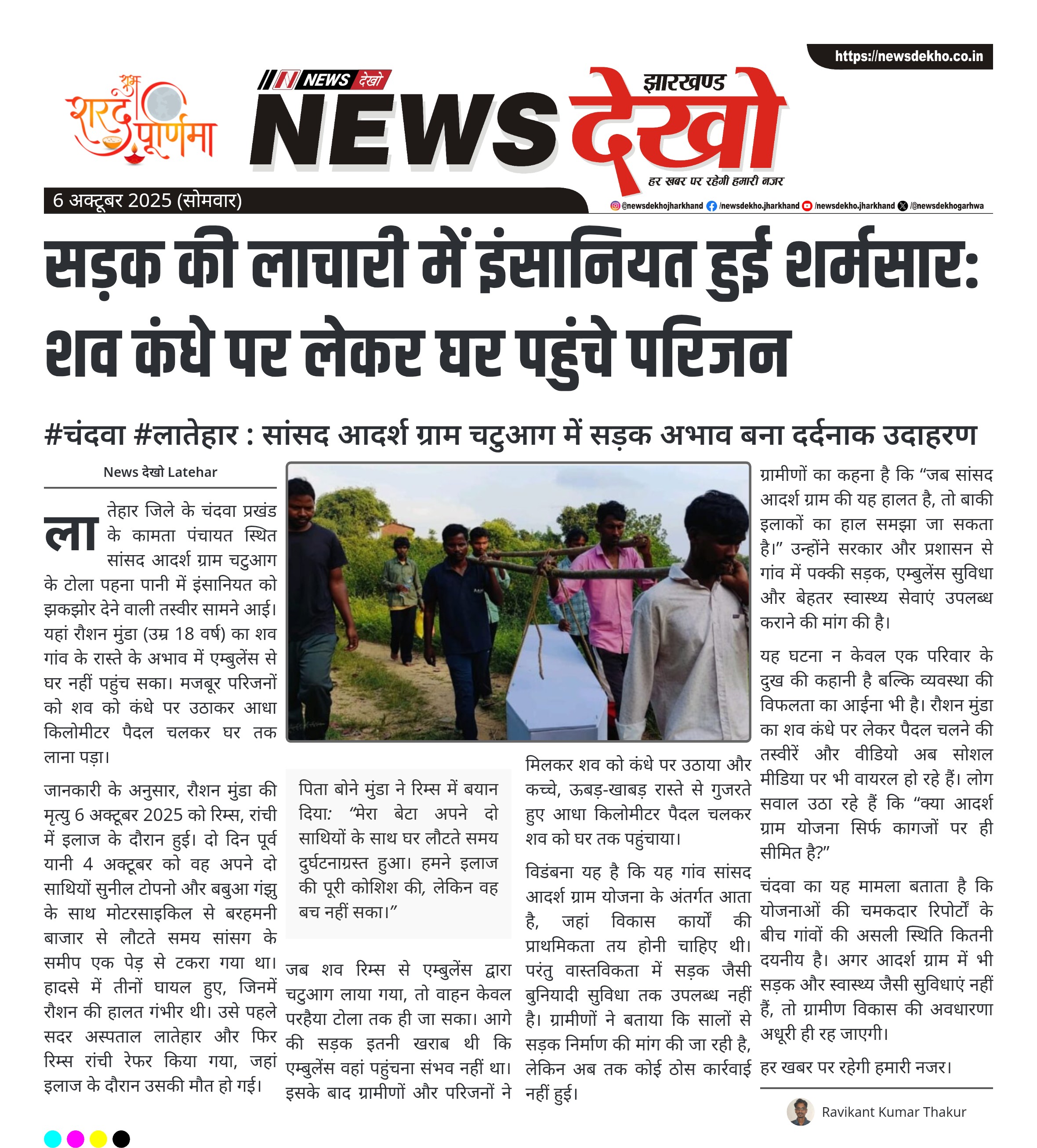 #चंदवा #लातेहार : सांसद आदर्श ग्राम चटुआग में सड़क अभाव बना दर्दनाक उदाहरण चंदवा प्रखंड के चटुआग गांव में सड़क की बदहाली से हुआ मानवीय संकट। रिम्स से एम्बुलेंस शव लेकर गांव तक पहुंची, पर सड़क नहीं होने से आगे नहीं जा सकी। परिजनों ने कंधे पर शव उठाकर आधा किलोमीटर तक पैदल चलकर पहुंचाया घर। मृतक रौशन मुंडा (18 वर्ष) की मौत सड़क हादसे में हुई थी। मामला सांसद आदर्श ग्राम चटुआग का, जहां मूलभूत सुविधाओं का अभाव स्पष्ट…