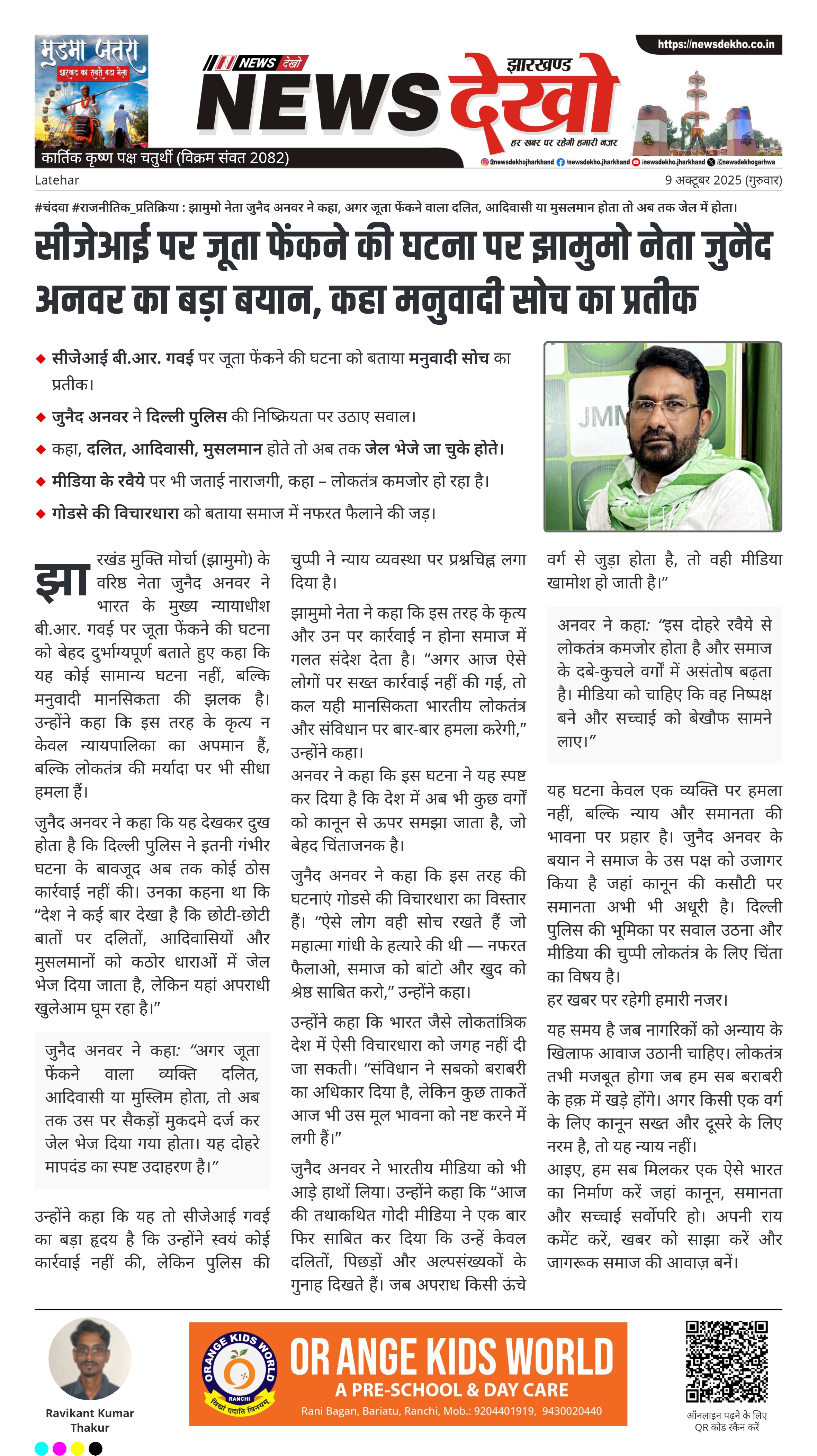 #चंदवा #राजनीतिक_प्रतिक्रिया : झामुमो नेता जुनैद अनवर ने कहा, अगर जूता फेंकने वाला दलित, आदिवासी या मुसलमान होता तो अब तक जेल में होता। सीजेआई बी.आर. गवई पर जूता फेंकने की घटना को बताया मनुवादी सोच का प्रतीक। जुनैद अनवर ने दिल्ली पुलिस की निष्क्रियता पर उठाए सवाल। कहा, दलित, आदिवासी, मुसलमान होते तो अब तक जेल भेजे जा चुके होते। मीडिया के रवैये पर भी जताई नाराजगी, कहा – लोकतंत्र कमजोर हो रहा है। गोडसे की विचारधारा को बताया…