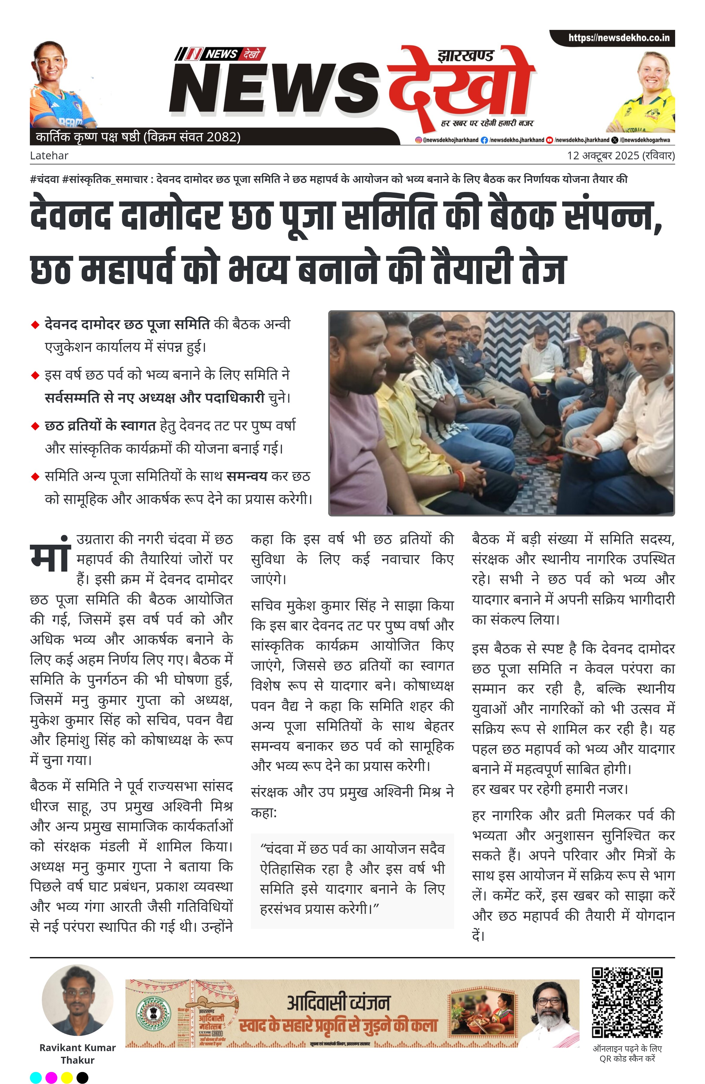 #चंदवा #सांस्कृतिक_समाचार : देवनद दामोदर छठ पूजा समिति ने छठ महापर्व के आयोजन को भव्य बनाने के लिए बैठक कर निर्णायक योजना तैयार की देवनद दामोदर छठ पूजा समिति की बैठक अन्वी एजुकेशन कार्यालय में संपन्न हुई। इस वर्ष छठ पर्व को भव्य बनाने के लिए समिति ने सर्वसम्मति से नए अध्यक्ष और पदाधिकारी चुने। समिति ने पूर्व राज्यसभा सांसद धीरज साहू, उप प्रमुख अश्विनी मिश्र सहित प्रमुख सामाजिक कार्यकर्ताओं को संरक्षक मंडली में शामिल किया। छठ व्रतियों के स्वागत…