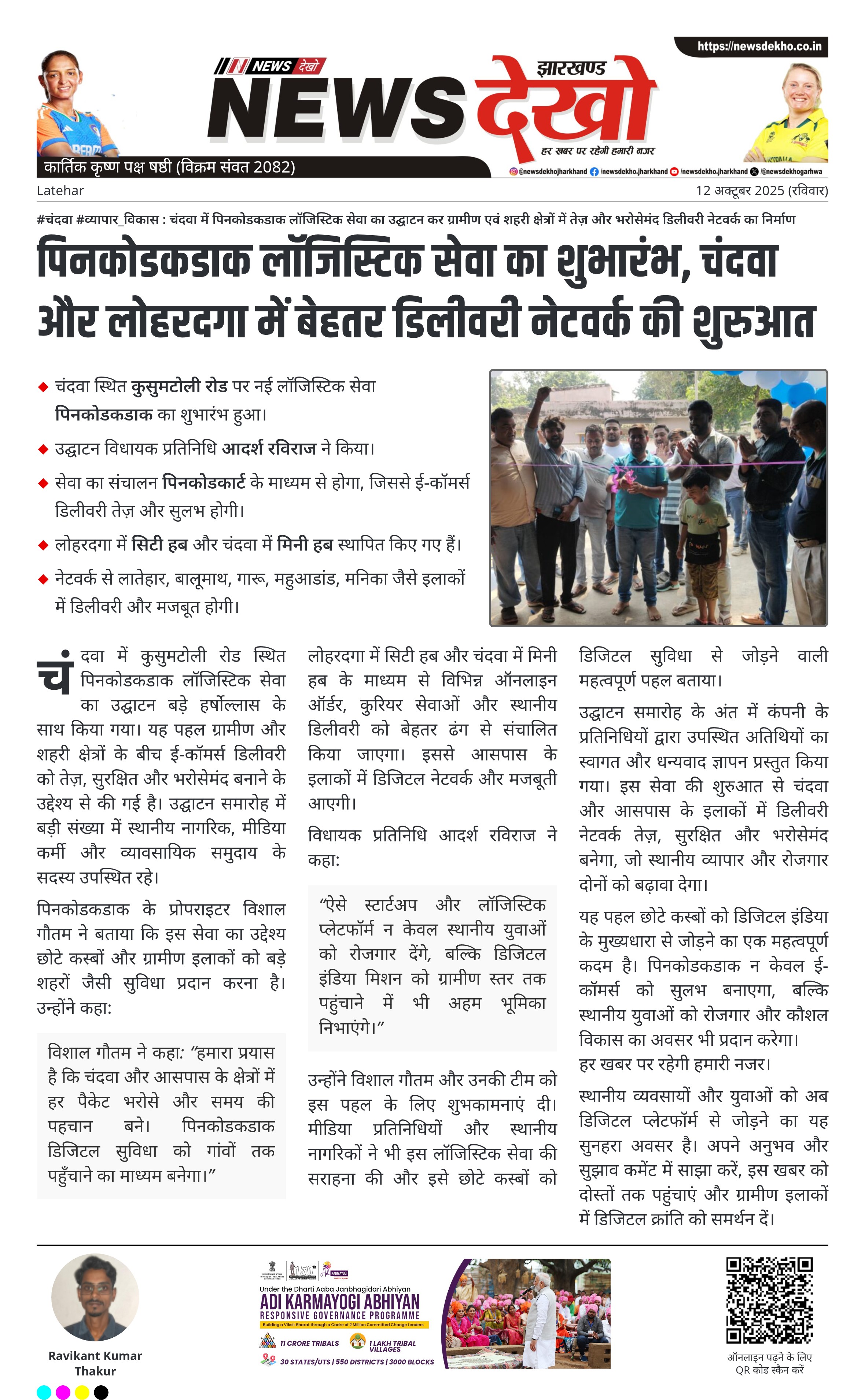 #चंदवा #व्यापार_विकास : चंदवा में पिनकोडकडाक लॉजिस्टिक सेवा का उद्घाटन कर ग्रामीण एवं शहरी क्षेत्रों में तेज़ और भरोसेमंद डिलीवरी नेटवर्क का निर्माण चंदवा स्थित कुसुमटोली रोड पर नई लॉजिस्टिक सेवा पिनकोडकडाक का शुभारंभ हुआ। उद्घाटन विधायक प्रतिनिधि आदर्श रविराज ने किया। सेवा का संचालन पिनकोडकार्ट के माध्यम से होगा, जिससे ई-कॉमर्स डिलीवरी तेज़ और सुलभ होगी। लोहरदगा में सिटी हब और चंदवा में मिनी हब स्थापित किए गए हैं। नेटवर्क से लातेहार, बालूमाथ, गारू, महुआडांड, मनिका जैसे इलाकों में…