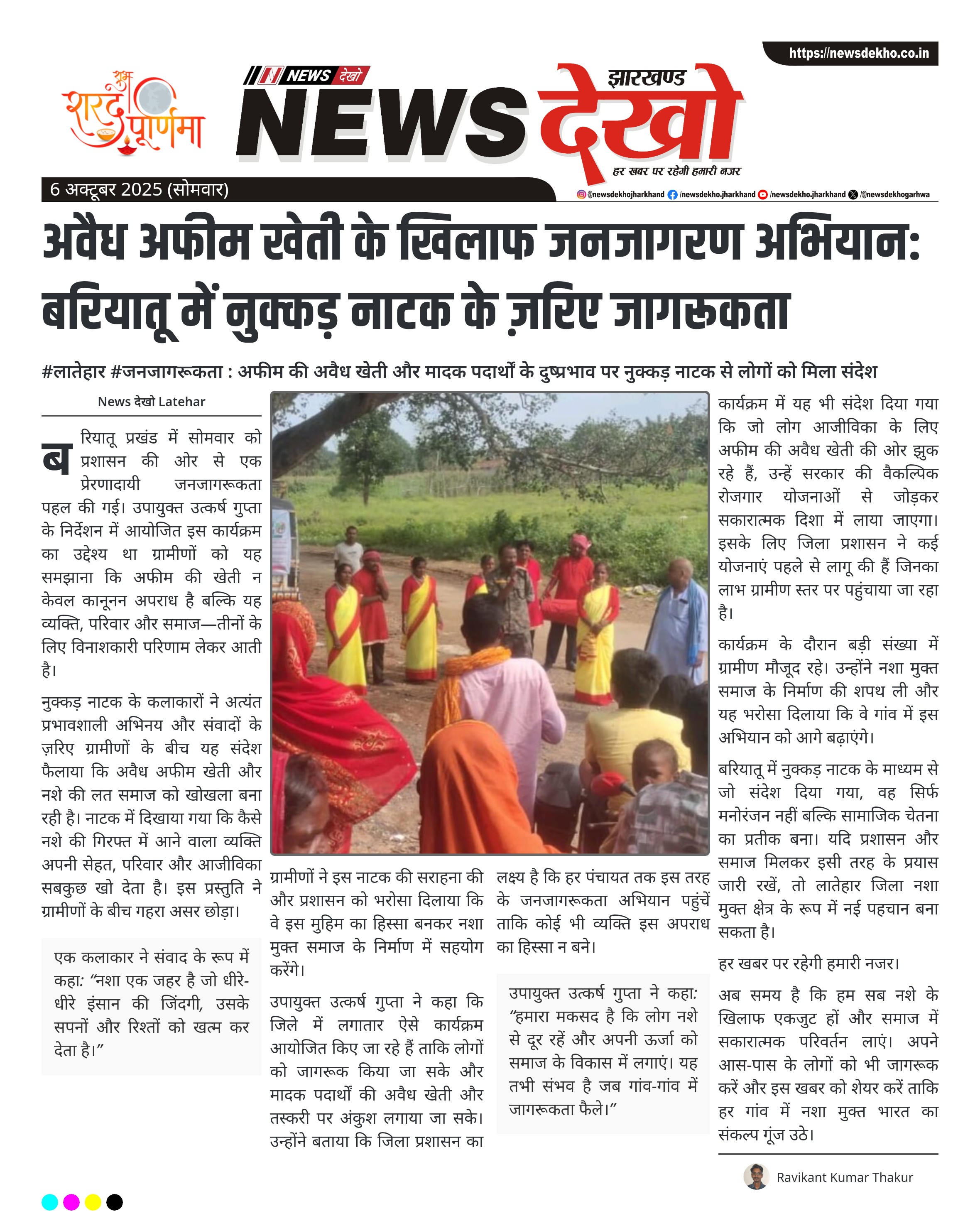 #लातेहार #जनजागरूकता : अफीम की अवैध खेती और मादक पदार्थों के दुष्प्रभाव पर नुक्कड़ नाटक से लोगों को मिला संदेश बरियातू प्रखंड में नुक्कड़ नाटक के माध्यम से ग्रामीणों को अफीम की अवैध खेती के दुष्प्रभाव बताए गए। कार्यक्रम उपायुक्त उत्कर्ष गुप्ता के निर्देश पर आयोजित किया गया। नाटक में कलाकारों ने नशे के सामाजिक, मानसिक और पारिवारिक नुकसान को जीवंत अभिनय से दर्शाया। ग्रामीणों ने नशामुक्त समाज के निर्माण का संकल्प लिया। उपायुक्त ने कहा — जनजागरूकता ही मादक…