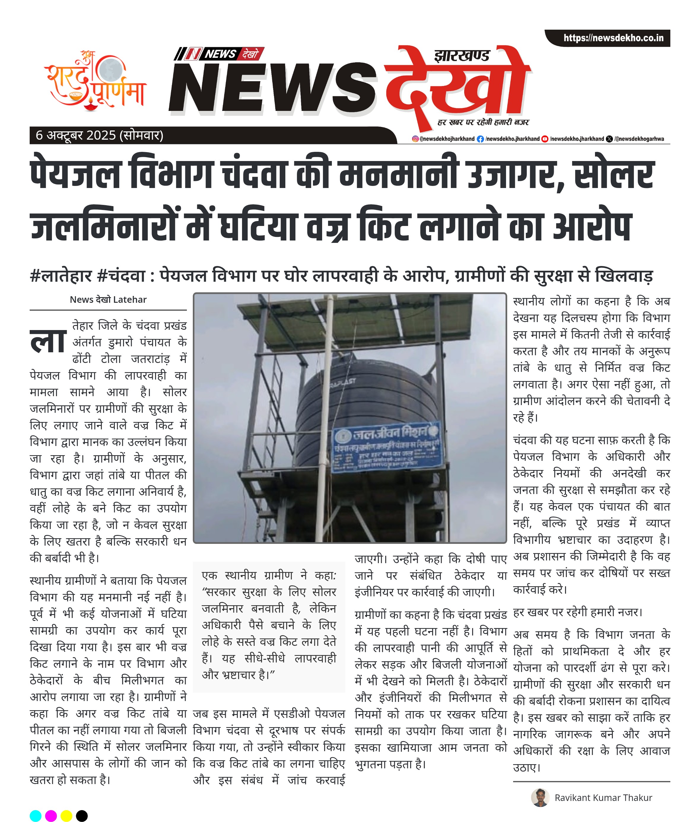 पेयजल विभाग चंदवा की मनमानी उजागर, सोलर जलमिनारों में घटिया वज्र किट लगाने का आरोप