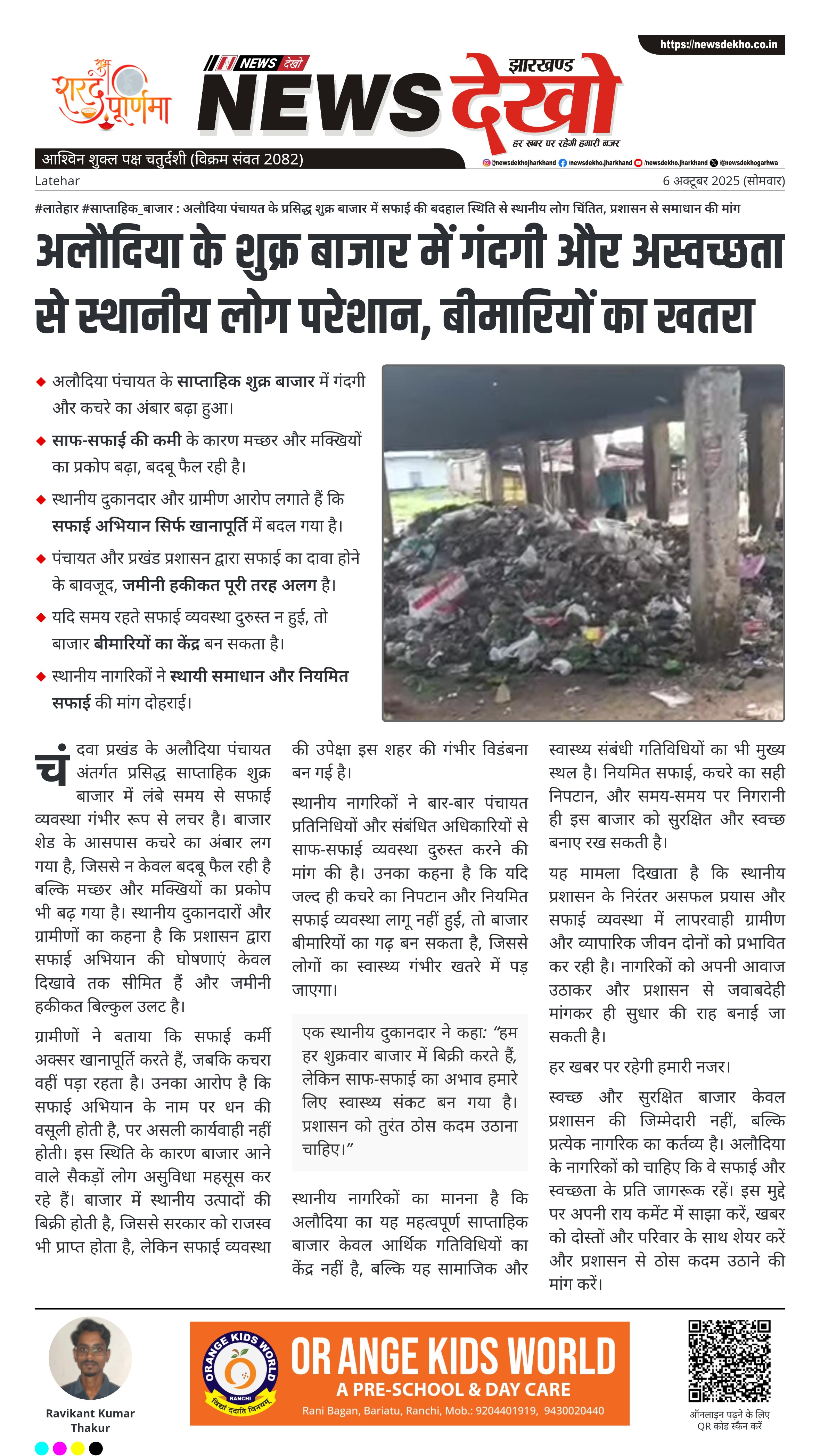 #लातेहार #साप्ताहिक_बाजार : अलौदिया पंचायत के प्रसिद्ध शुक्र बाजार में सफाई की बदहाल स्थिति से स्थानीय लोग चिंतित, प्रशासन से समाधान की मांग अलौदिया पंचायत के साप्ताहिक शुक्र बाजार में गंदगी और कचरे का अंबार बढ़ा हुआ। साफ-सफाई की कमी के कारण मच्छर और मक्खियों का प्रकोप बढ़ा, बदबू फैल रही है। स्थानीय दुकानदार और ग्रामीण आरोप लगाते हैं कि सफाई अभियान सिर्फ खानापूर्ति में बदल गया है। पंचायत और प्रखंड प्रशासन द्वारा सफाई का दावा होने के बावजूद, जमीनी…