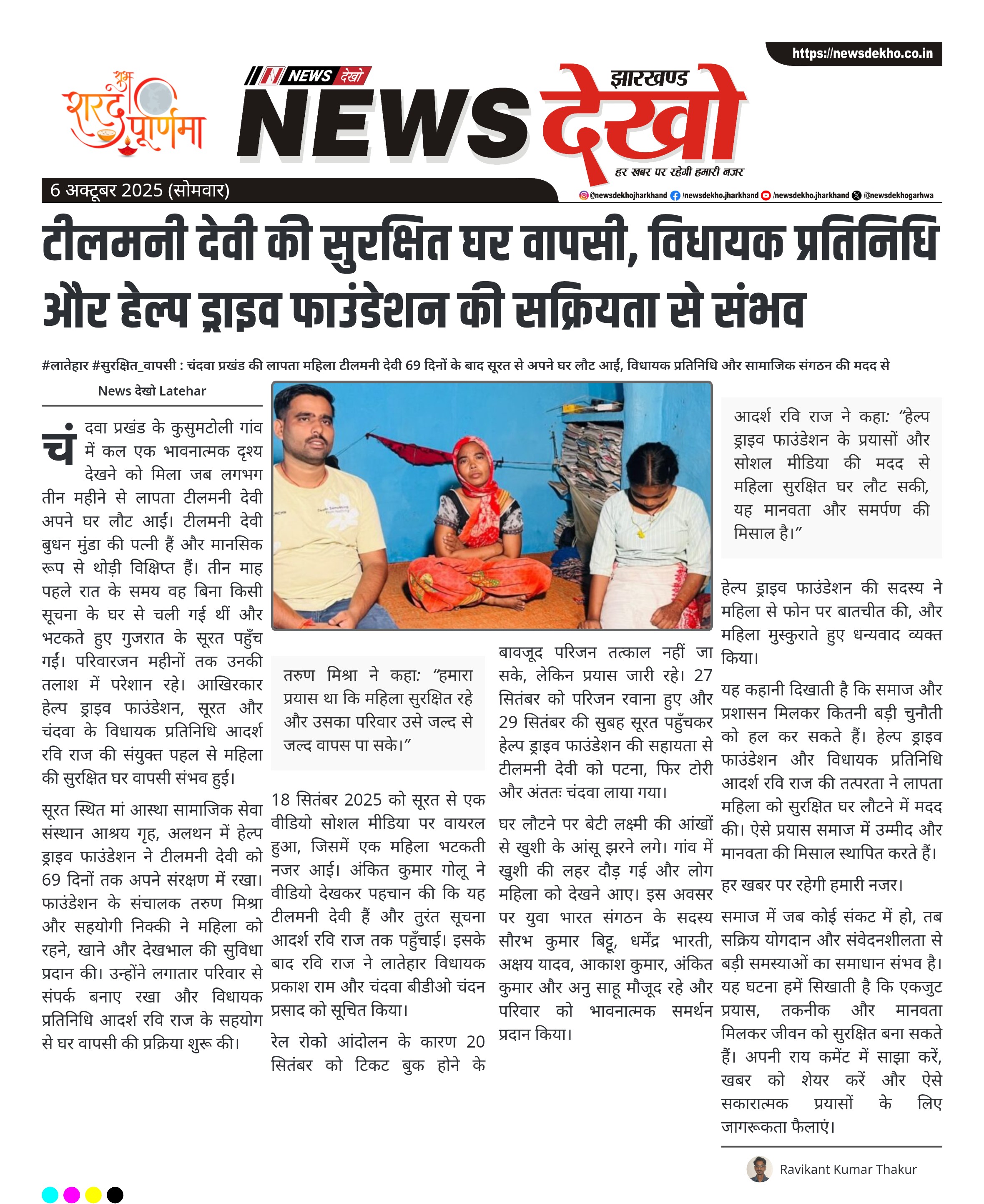टीलमनी देवी की सुरक्षित घर वापसी, विधायक प्रतिनिधि और हेल्प ड्राइव फाउंडेशन की सक्रियता से संभव