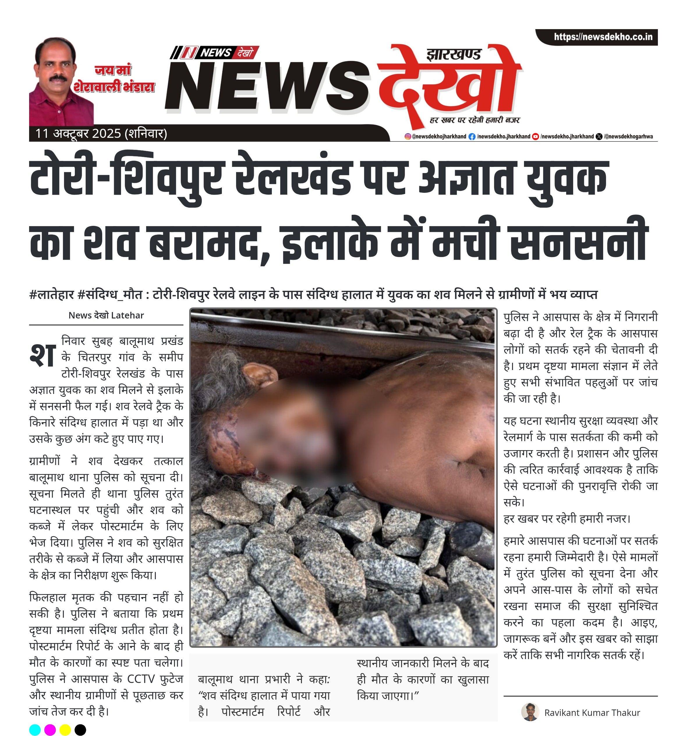 #लातेहार #संदिग्ध_मौत : टोरी-शिवपुर रेलवे लाइन के पास संदिग्ध हालात में युवक का शव मिलने से ग्रामीणों में भय व्याप्त बालूमाथ प्रखंड, टोरी-शिवपुर रेलखंड के चितरपुर गांव के समीप अज्ञात युवक का शव बरामद। शव रेलवे ट्रैक के किनारे मिला और कुछ अंग कटे हुए थे। ग्रामीणों ने तुरंत पुलिस को सूचना दी, बालूमाथ थाना पुलिस ने जांच शुरू की। शव को पोस्टमार्टम हेतु कब्जे में लिया गया, मृतक की पहचान अभी तक नहीं हो सकी। पुलिस ने प्राथमिक जांच…