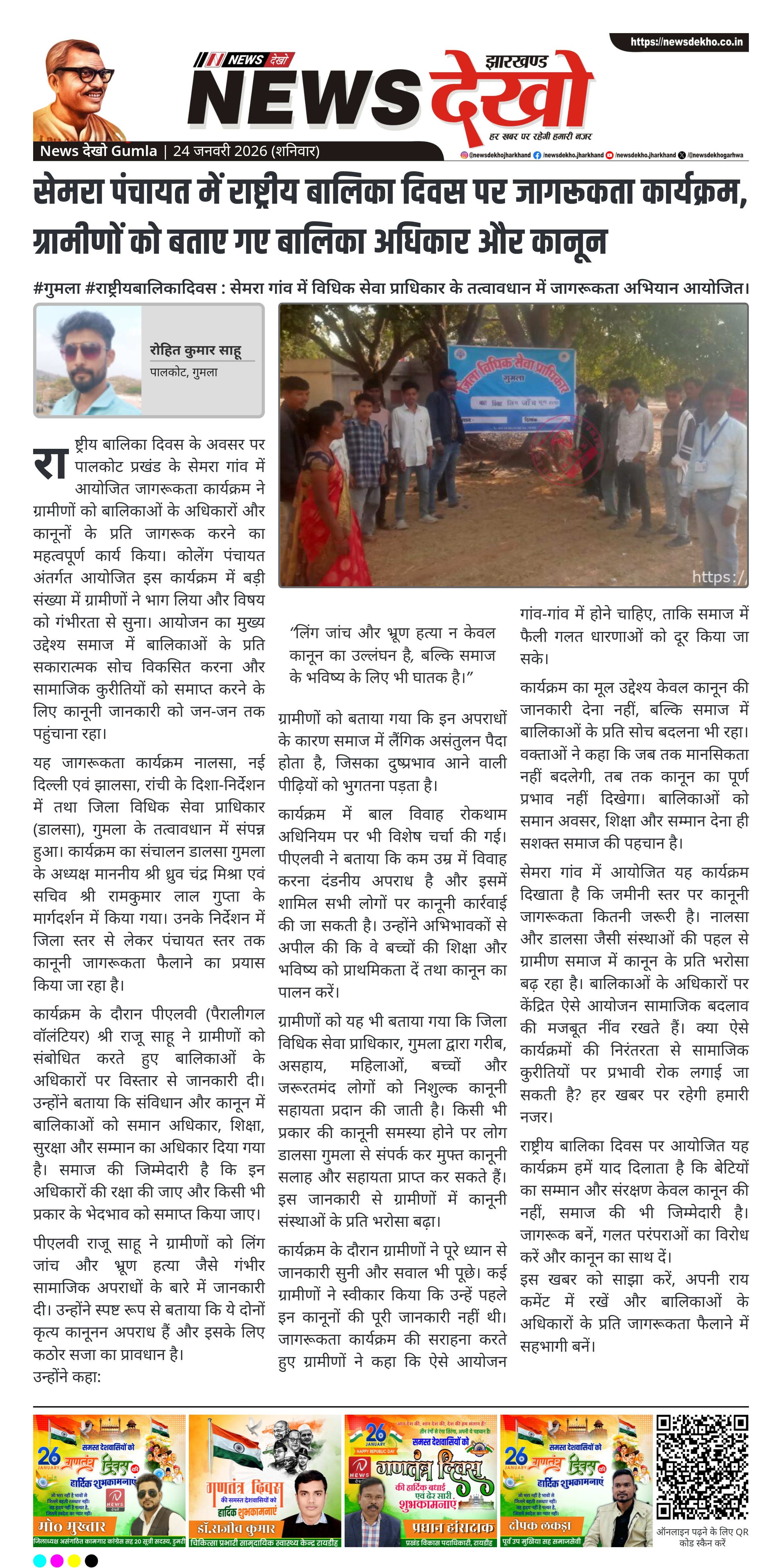 #गुमला #राष्ट्रीयबालिकादिवस : सेमरा गांव में विधिक सेवा प्राधिकार के तत्वावधान में जागरूकता अभियान आयोजित। राष्ट्रीय बालिका दिवस पर सेमरा ग्राम, कोलेंग पंचायत में जागरूकता कार्यक्रम। आयोजन नालसा और झालसा के निर्देश पर डालसा गुमला के तत्वावधान में। पीएलवी राजू साहू ने बालिका अधिकारों व कानूनों की दी जानकारी। लिंग जांच, भ्रूण हत्या और बाल विवाह को बताया दंडनीय अपराध। डालसा गुमला की ओर से निशुल्क कानूनी सहायता की जानकारी साझा। राष्ट्रीय बालिका दिवस के अवसर पर पालकोट प्रखंड के…