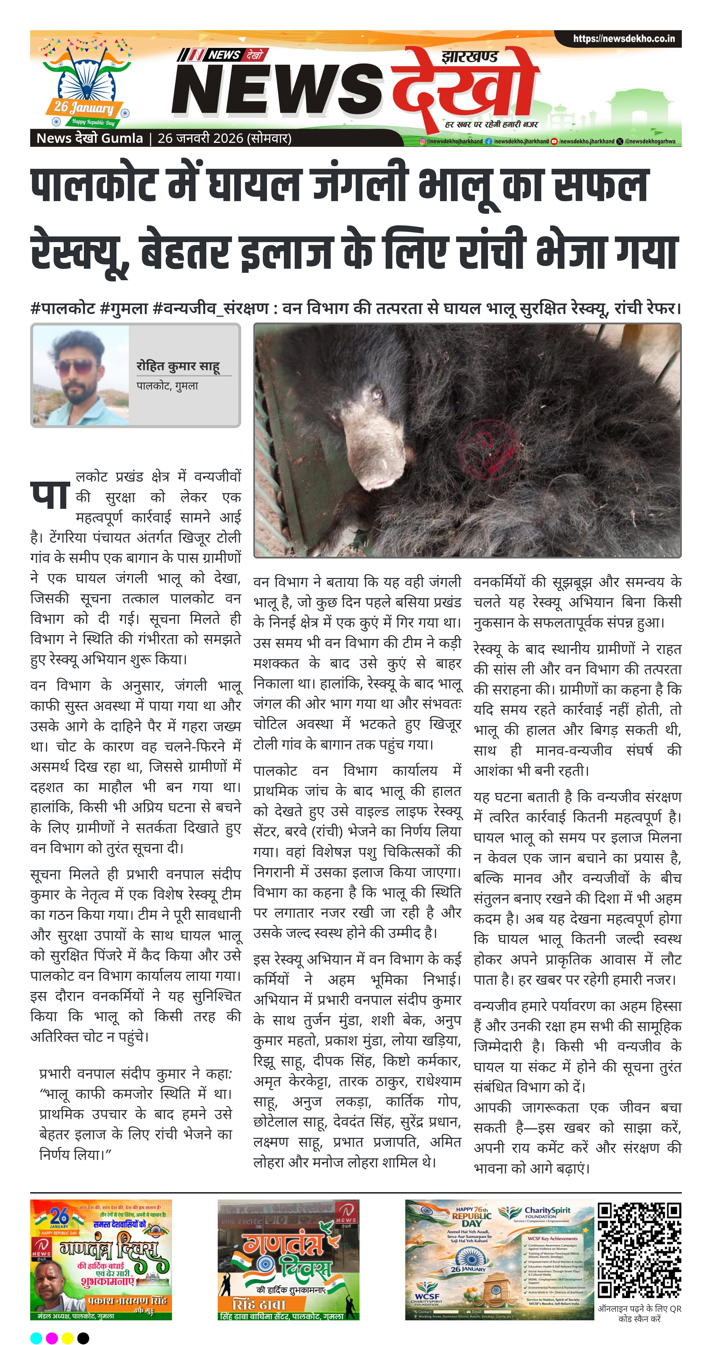 #पालकोट #गुमला #वन्यजीव_संरक्षण : वन विभाग की तत्परता से घायल भालू सुरक्षित रेस्क्यू, रांची रेफर। टेंगरिया पंचायत के खिजूर टोली गांव के बागान के पास मिला घायल भालू। पालकोट वन विभाग की टीम ने सुरक्षित रेस्क्यू किया। भालू के दाहिने अगले पैर में गहरा जख्म। प्राथमिक जांच के बाद वाइल्ड लाइफ रेस्क्यू सेंटर, रांची भेजा गया। पहले बसिया प्रखंड के निनई क्षेत्र में कुएं में गिरने की घटना। रेस्क्यू अभियान में कई वनकर्मियों की सक्रिय भूमिका। पालकोट प्रखंड क्षेत्र में…