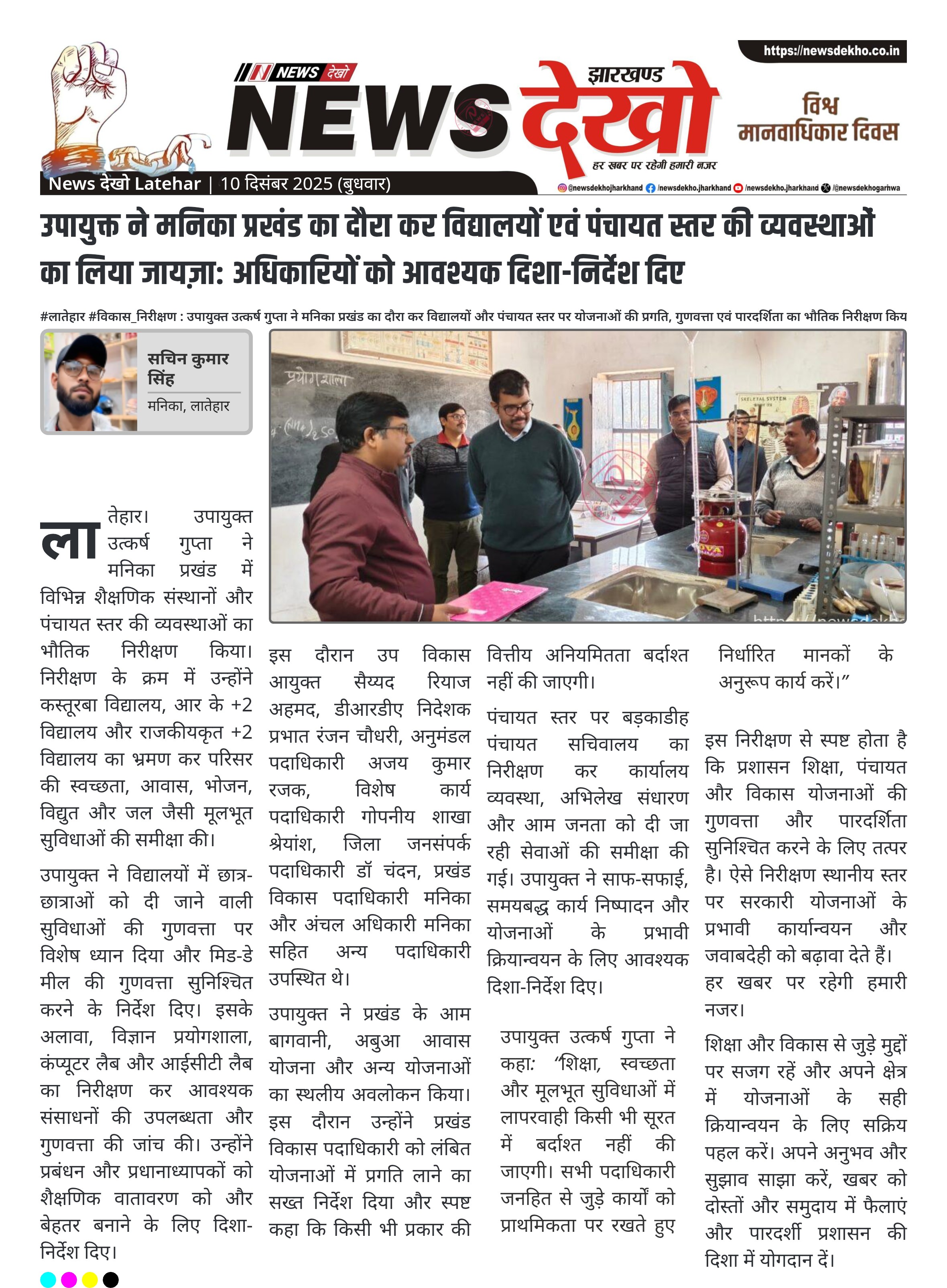 #लातेहार #विकास_निरीक्षण : उपायुक्त उत्कर्ष गुप्ता ने मनिका प्रखंड का दौरा कर विद्यालयों और पंचायत स्तर पर योजनाओं की प्रगति, गुणवत्ता एवं पारदर्शिता का भौतिक निरीक्षण किया। उपायुक्त उत्कर्ष गुप्ता ने मनिका प्रखंड का निरीक्षण कर योजनाओं की प्रगति और गुणवत्ता का लिया जायजा। कस्तूरबा विद्यालय, आर के +2 विद्यालय एवं राजकीयकृत +2 विद्यालय में स्वच्छता, आवास, जल, विद्युत और मिड-डे मील की समीक्षा। विज्ञान प्रयोगशाला, कंप्यूटर लैब एवं आईसीटी लैब का निरीक्षण कर संसाधनों और शैक्षणिक वातावरण की जांच।…