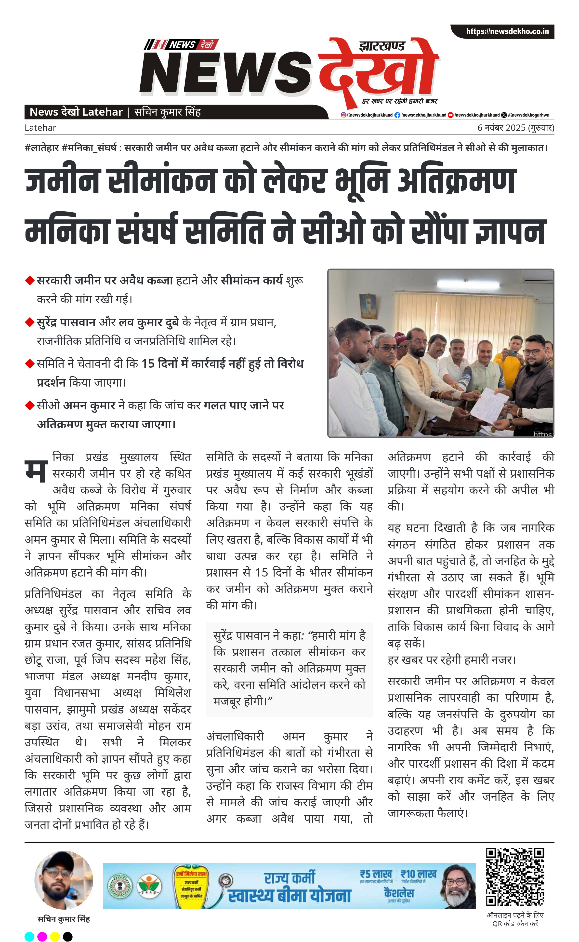 #लातेहार #मनिका_संघर्ष : सरकारी जमीन पर अवैध कब्जा हटाने और सीमांकन कराने की मांग को लेकर प्रतिनिधिमंडल ने सीओ से की मुलाकात। भूमि अतिक्रमण मनिका संघर्ष समिति के नेतृत्व में प्रतिनिधिमंडल ने अंचलाधिकारी अमन कुमार को सौंपा ज्ञापन। सरकारी जमीन पर अवैध कब्जा हटाने और सीमांकन कार्य शुरू करने की मांग रखी गई। सुरेंद्र पासवान और लव कुमार दुबे के नेतृत्व में ग्राम प्रधान, राजनीतिक प्रतिनिधि व जनप्रतिनिधि शामिल रहे। समिति ने चेतावनी दी कि 15 दिनों में कार्रवाई नहीं…