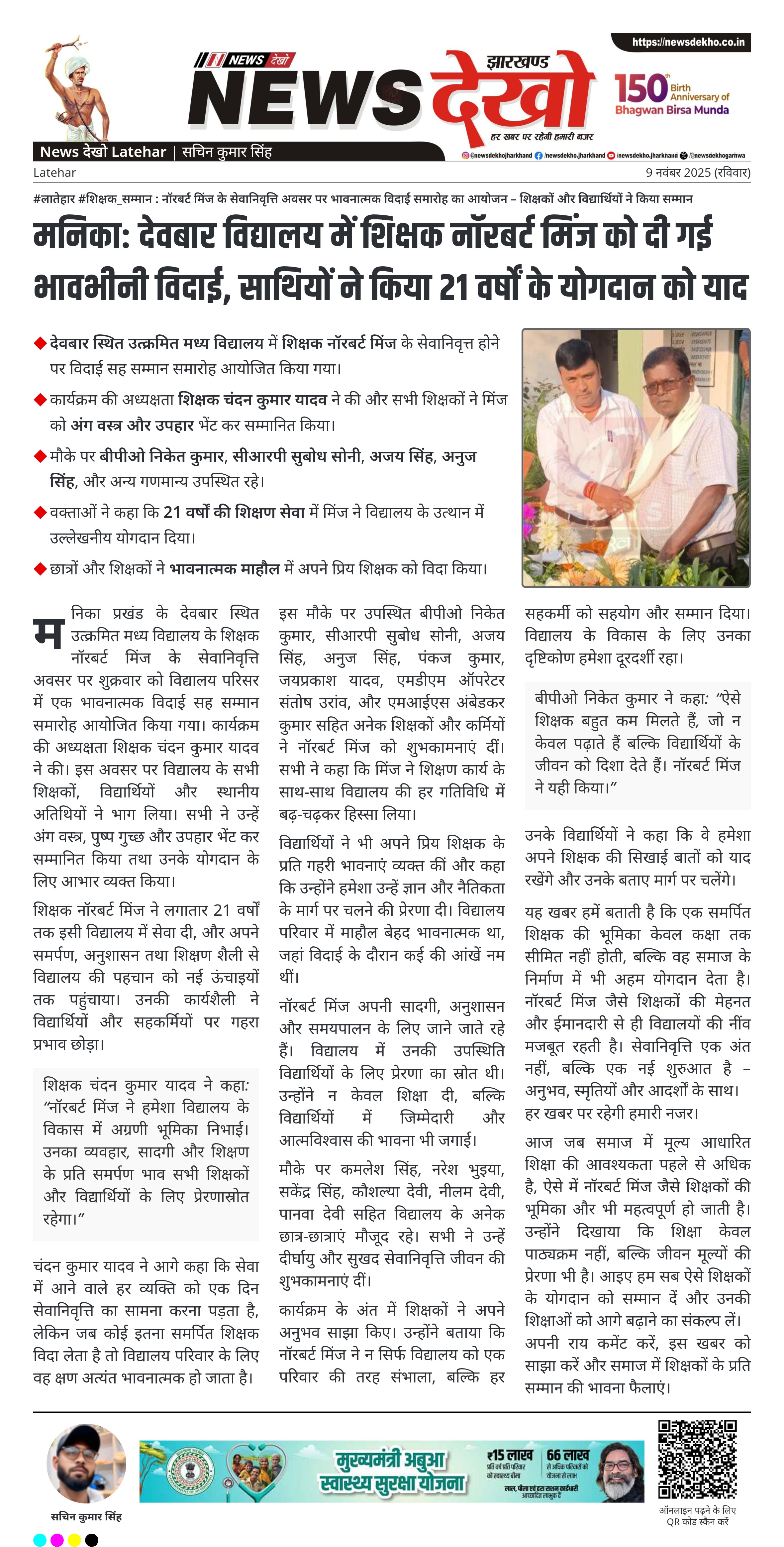 #लातेहार #शिक्षक_सम्मान : नॉरबर्ट मिंज के सेवानिवृत्ति अवसर पर भावनात्मक विदाई समारोह का आयोजन – शिक्षकों और विद्यार्थियों ने किया सम्मान देवबार स्थित उत्क्रमित मध्य विद्यालय में शिक्षक नॉरबर्ट मिंज के सेवानिवृत्त होने पर विदाई सह सम्मान समारोह आयोजित किया गया। कार्यक्रम की अध्यक्षता शिक्षक चंदन कुमार यादव ने की और सभी शिक्षकों ने मिंज को अंग वस्त्र और उपहार भेंट कर सम्मानित किया। मौके पर बीपीओ निकेत कुमार, सीआरपी सुबोध सोनी, अजय सिंह, अनुज सिंह, और अन्य गणमान्य उपस्थित…