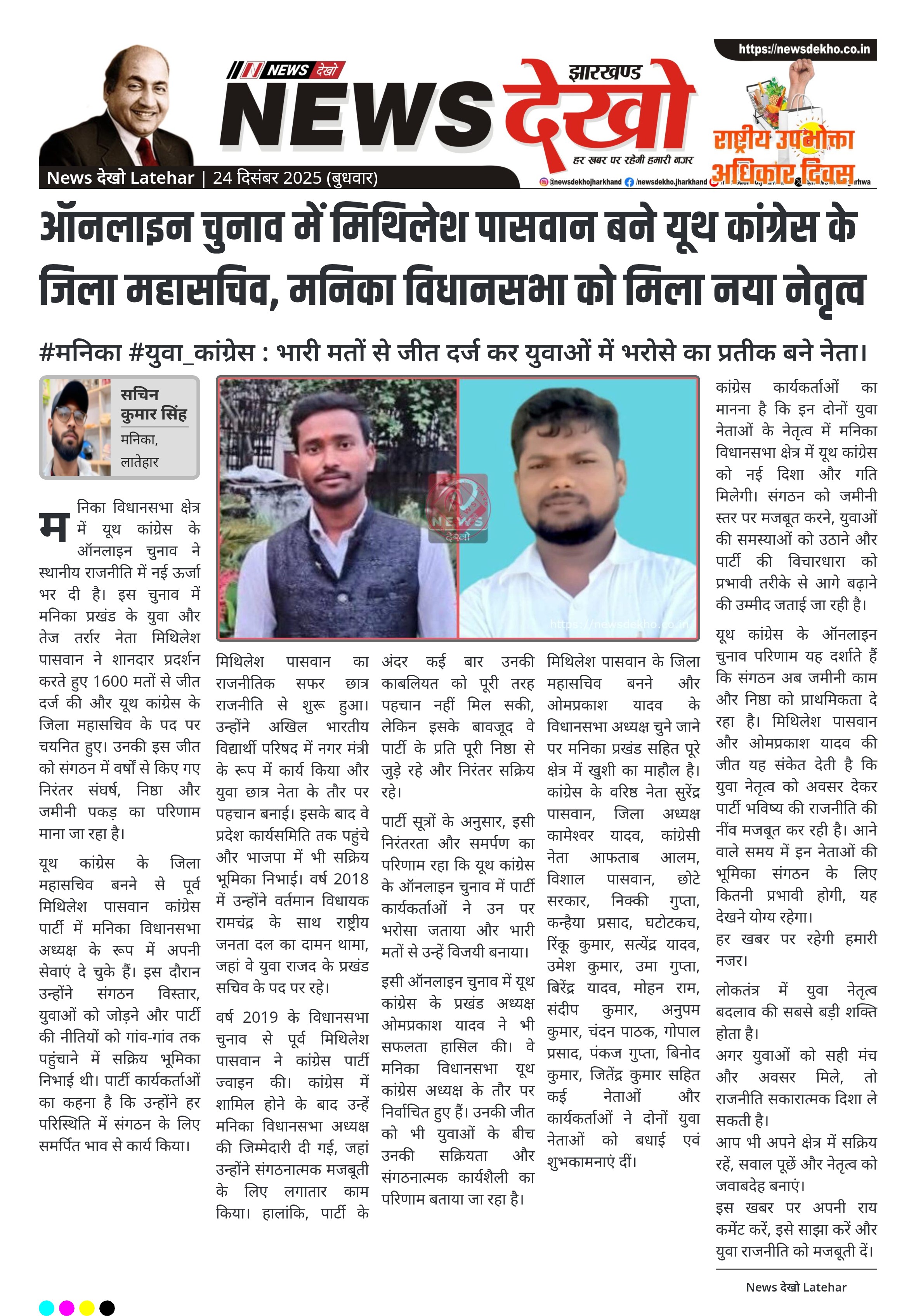 ऑनलाइन चुनाव में मिथिलेश पासवान बने यूथ कांग्रेस के जिला महासचिव, मनिका विधानसभा को मिला नया नेतृत्व