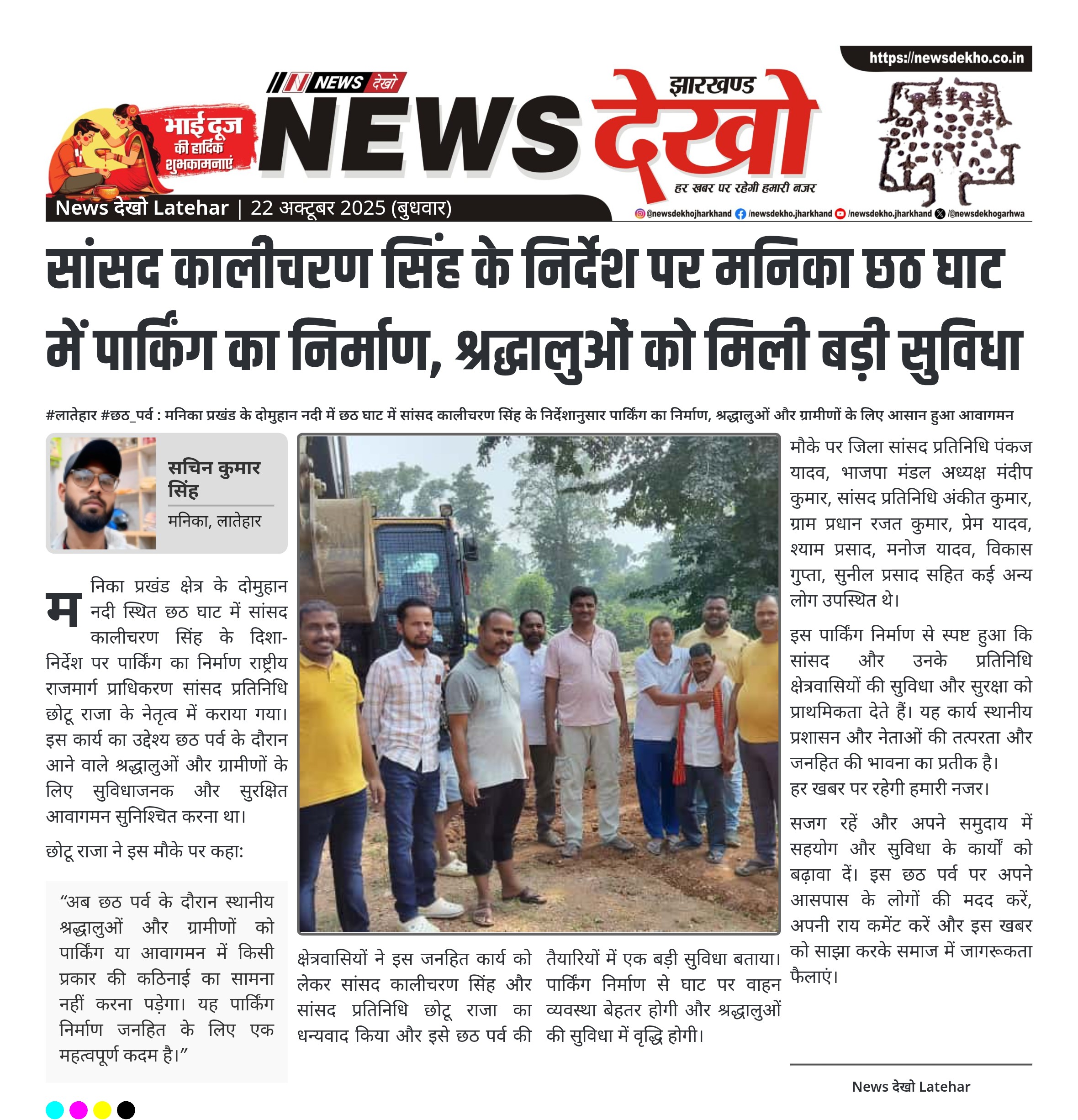 #लातेहार #छठ_पर्व : मनिका प्रखंड के दोमुहान नदी में छठ घाट में सांसद कालीचरण सिंह के निर्देशानुसार पार्किंग का निर्माण, श्रद्धालुओं और ग्रामीणों के लिए आसान हुआ आवागमन सांसद कालीचरण सिंह के निर्देश पर राष्ट्रीय राजमार्ग प्राधिकरण सांसद प्रतिनिधि छोटू राजा ने छठ घाट में पार्किंग का निर्माण कराया। पार्किंग निर्माण से स्थानीय श्रद्धालुओं और ग्रामीणों को छठ पर्व के दौरान आवागमन में सुविधा और सुरक्षा सुनिश्चित होगी। इस कार्य को लेकर क्षेत्रवासियों ने सांसद कालीचरण सिंह और सांसद प्रतिनिधि…