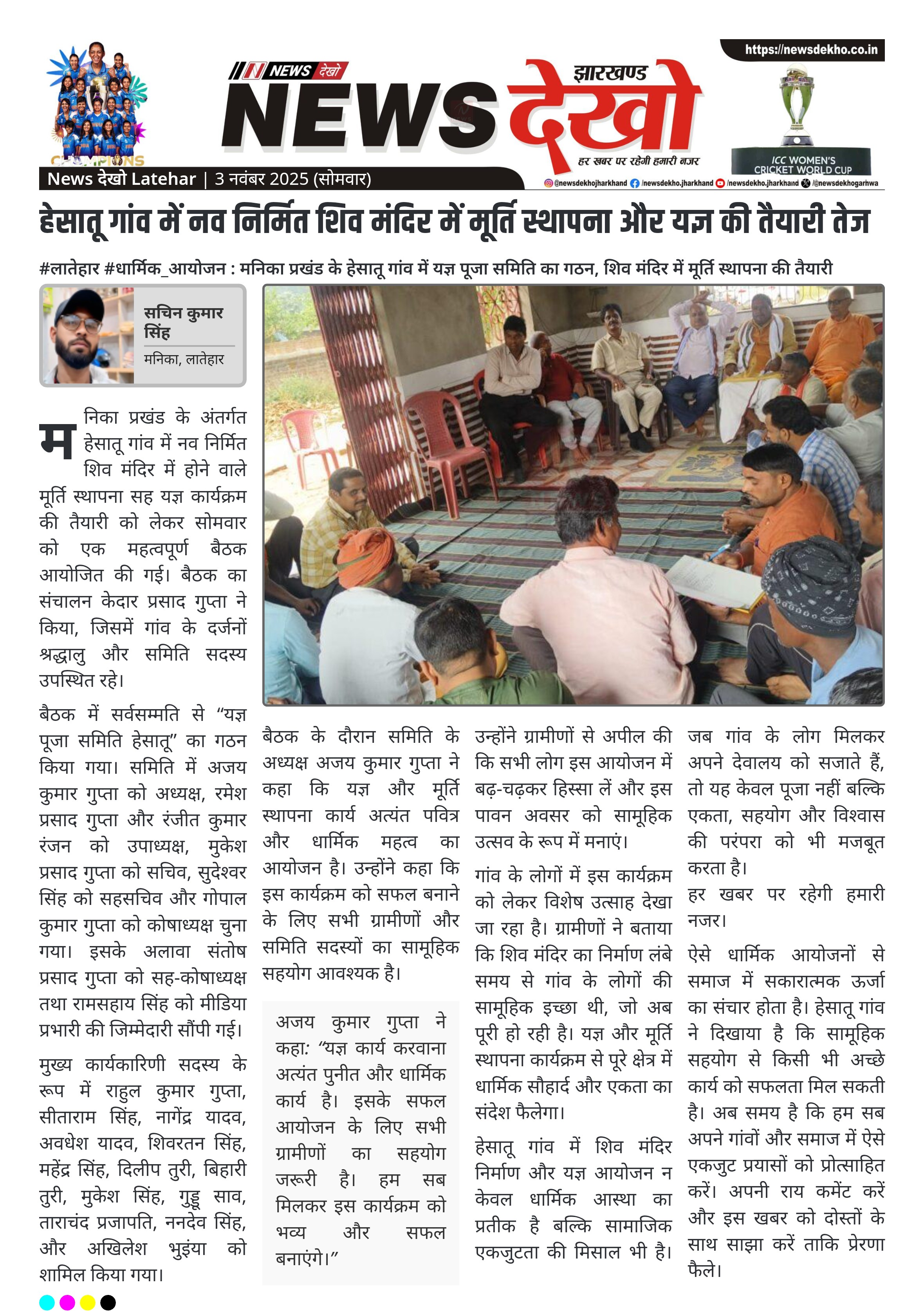 #लातेहार #धार्मिक_आयोजन : मनिका प्रखंड के हेसातू गांव में यज्ञ पूजा समिति का गठन, शिव मंदिर में मूर्ति स्थापना की तैयारी हेसातू गांव में नव निर्मित शिव मंदिर में मूर्ति स्थापना सह यज्ञ कार्यक्रम को लेकर बैठक आयोजित हुई। बैठक की अध्यक्षता केदार प्रसाद गुप्ता ने की और सर्वसम्मति से यज्ञ पूजा समिति का गठन हुआ। अजय कुमार गुप्ता बने अध्यक्ष, जबकि रमेश प्रसाद गुप्ता और रंजीत कुमार रंजन उपाध्यक्ष चुने गए। कार्यक्रम में धार्मिक एकता और सहयोग की भावना…