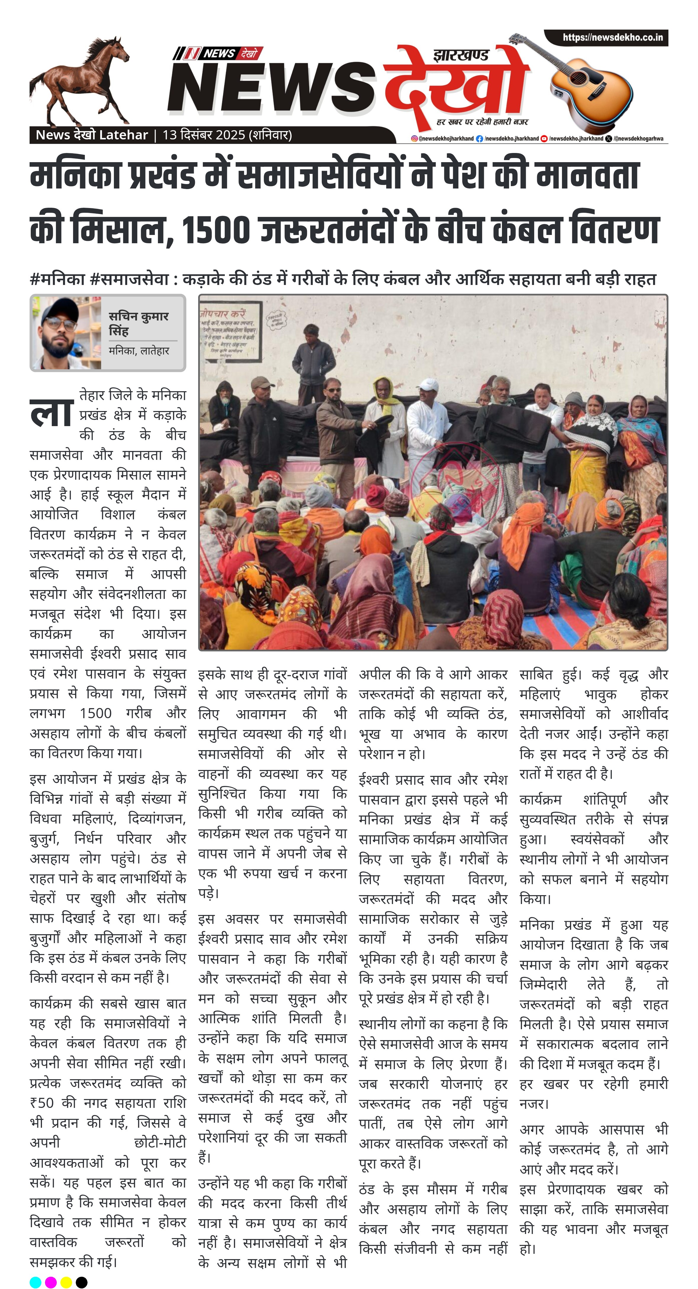 मनिका प्रखंड में समाजसेवियों ने पेश की मानवता की मिसाल, 1500 जरूरतमंदों के बीच कंबल वितरण