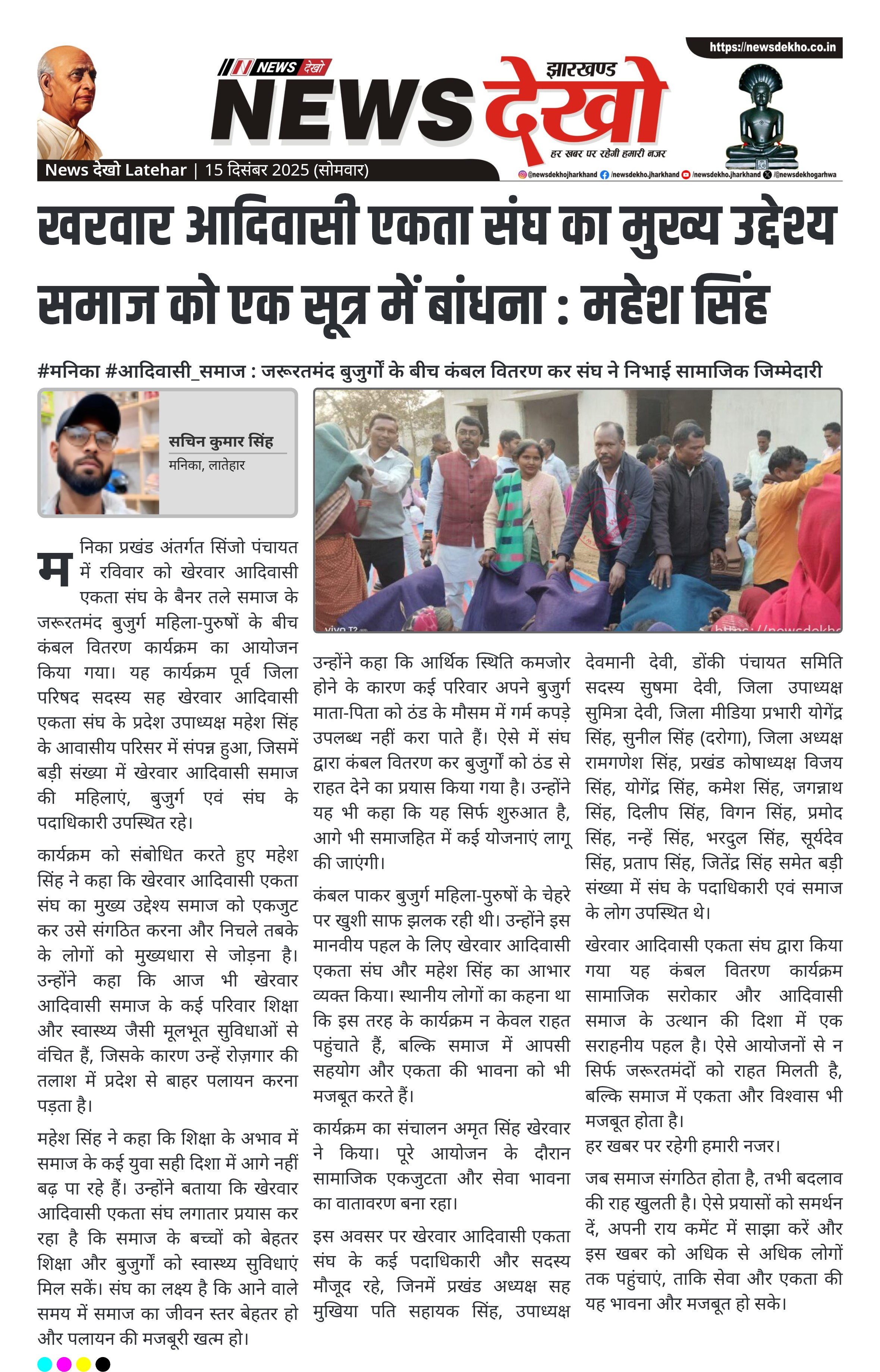 #मनिका #आदिवासी_समाज : जरूरतमंद बुजुर्गों के बीच कंबल वितरण कर संघ ने निभाई सामाजिक जिम्मेदारी मनिका प्रखंड के सिंजो पंचायत में खेरवार आदिवासी एकता संघ द्वारा कंबल वितरण कार्यक्रम आयोजित। पूर्व जिप सदस्य सह प्रदेश उपाध्यक्ष महेश सिंह के आवासीय परिसर में हुआ आयोजन। कड़ाके की ठंड में हजारों कंबलों का वितरण, बुजुर्गों को मिली राहत। शिक्षा और स्वास्थ्य के अभाव में हो रहे पलायन पर जताई चिंता। समाज के उत्थान के लिए भविष्य में और योजनाओं की घोषणा। मनिका…