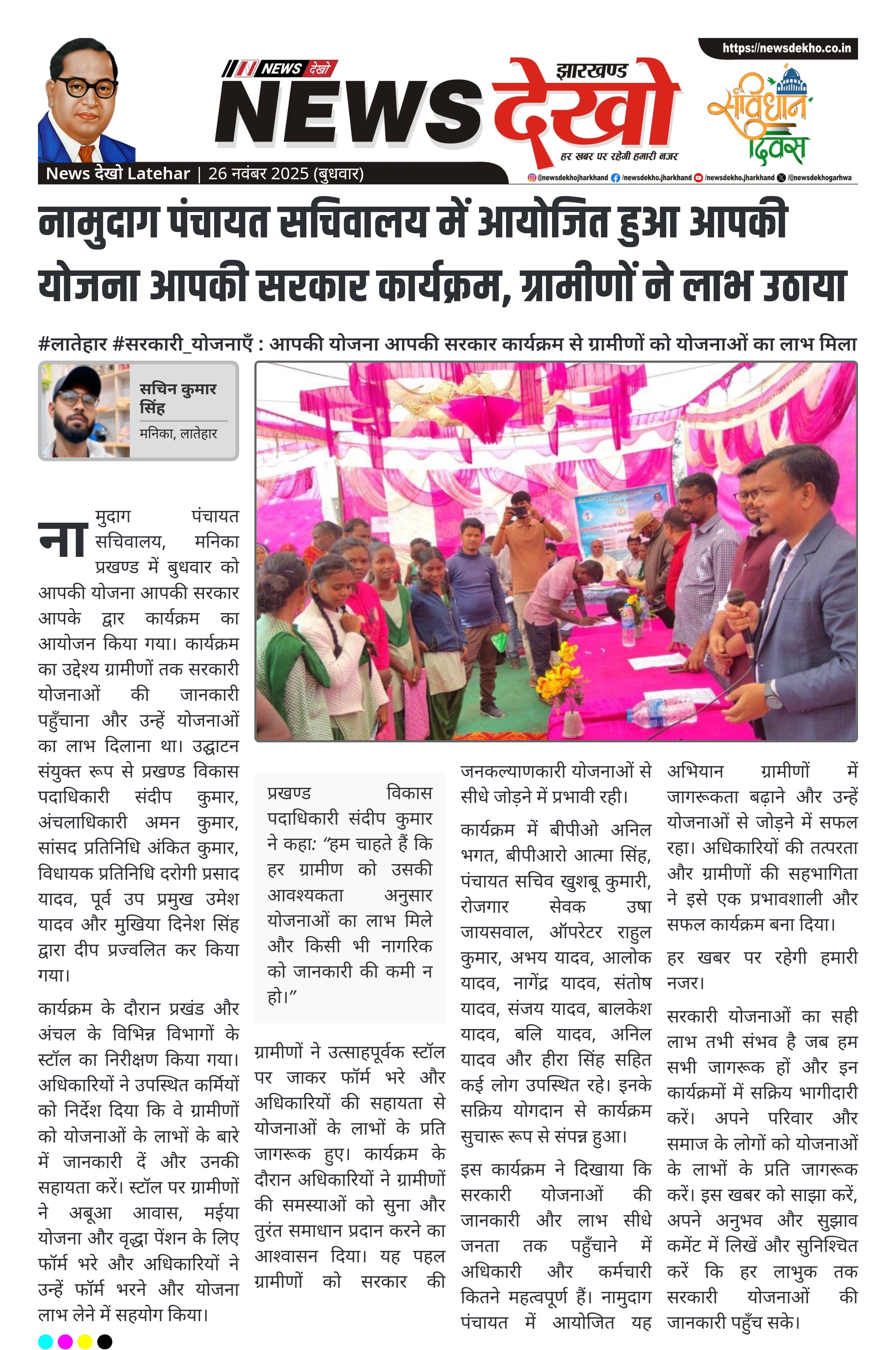 #लातेहार #सरकारी_योजनाएँ : आपकी योजना आपकी सरकार कार्यक्रम से ग्रामीणों को योजनाओं का लाभ मिला नामुदाग पंचायत सचिवालय में कार्यक्रम का आयोजन। उद्घाटन दीप प्रज्वलित कर किया गया। प्रखण्ड और अंचल अधिकारी ने स्टॉल का निरीक्षण किया। ग्रामीणों ने अबूआ आवास, मईया योजना, वृद्धा पेंशन के लिए फॉर्म भरे। कार्यक्रम में बीपीओ, बीपीआरो, पंचायत सचिव और अन्य कर्मचारी उपस्थित रहे। नामुदाग पंचायत सचिवालय, मनिका प्रखण्ड में बुधवार को आपकी योजना आपकी सरकार आपके द्वार कार्यक्रम का आयोजन किया गया। कार्यक्रम…