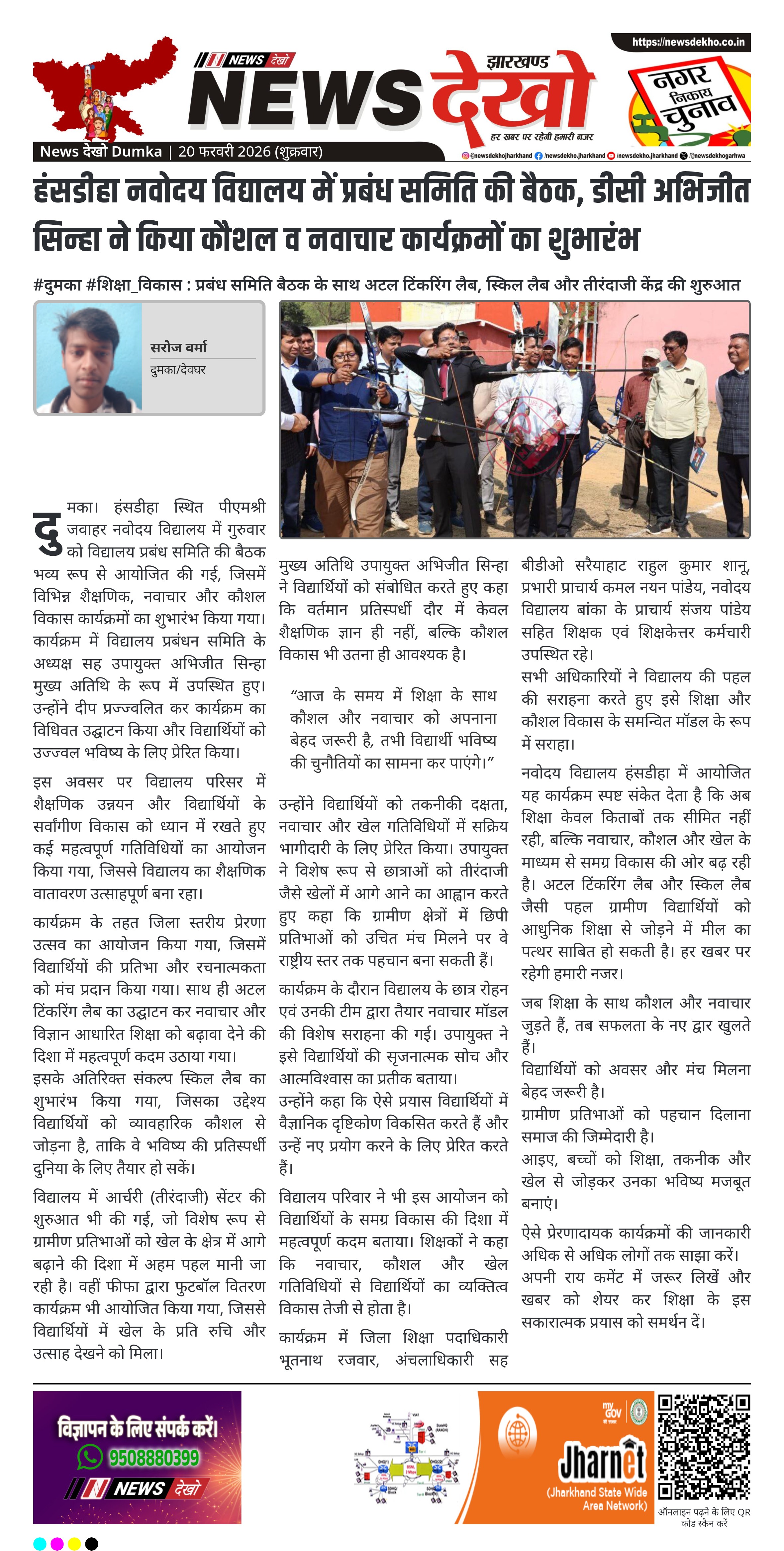 #दुमका #शिक्षा_विकास : प्रबंध समिति बैठक के साथ अटल टिंकरिंग लैब, स्किल लैब और तीरंदाजी केंद्र की शुरुआत उपायुक्त अभिजीत सिन्हा मुख्य अतिथि के रूप में कार्यक्रम में हुए शामिल। विद्यालय प्रबंध समिति की बैठक के साथ कई शैक्षणिक कार्यक्रमों का आयोजन। अटल टिंकरिंग लैब, संकल्प स्किल लैब और आर्चरी सेंटर का शुभारंभ। जिला स्तरीय प्रेरणा उत्सव एवं फीफा फुटबॉल वितरण कार्यक्रम आयोजित। विद्यार्थियों को शिक्षा के साथ कौशल, नवाचार और खेल में आगे बढ़ने की प्रेरणा। दुमका। हंसडीहा स्थित…