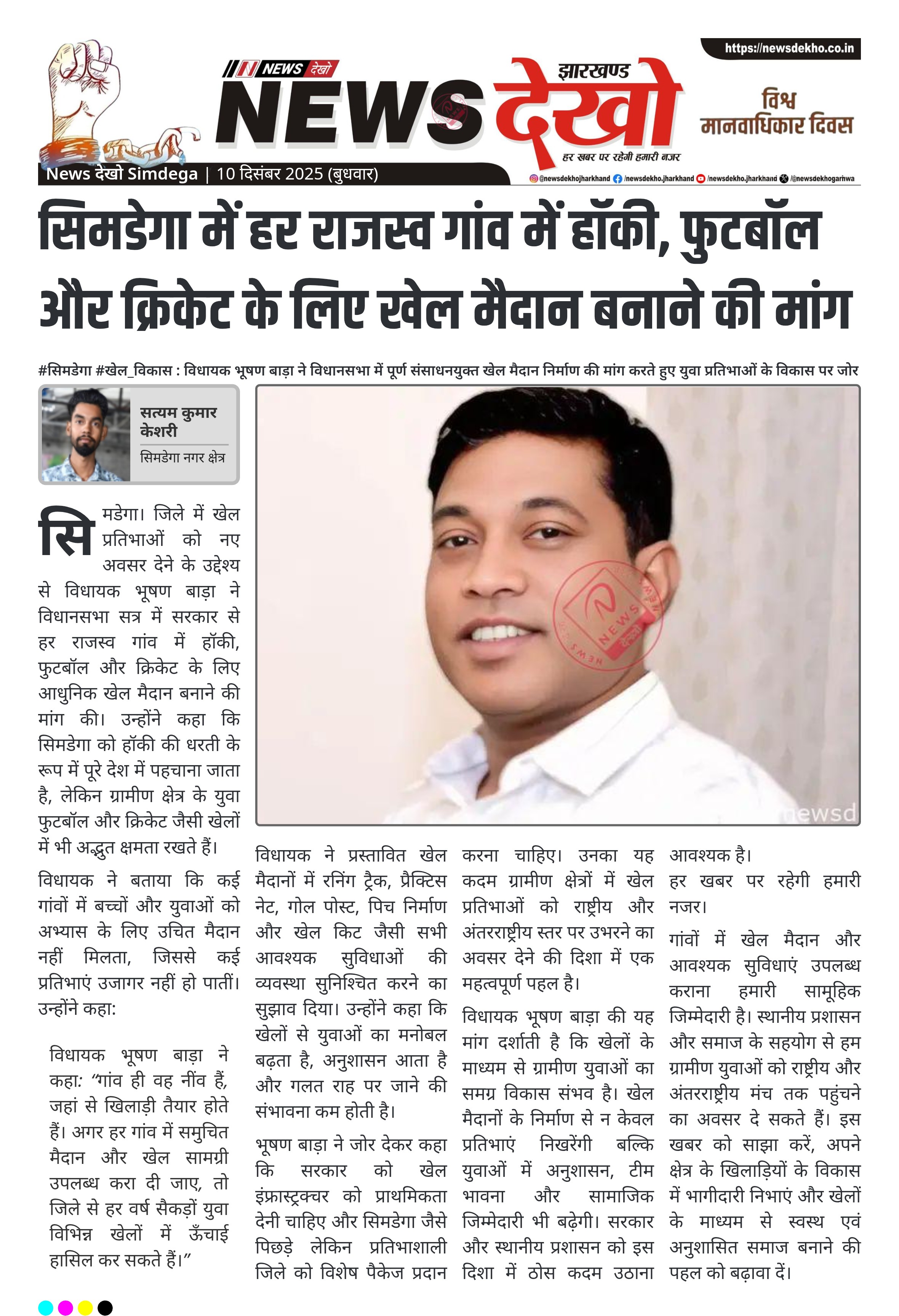#सिमडेगा #खेल_विकास : विधायक भूषण बाड़ा ने विधानसभा में पूर्ण संसाधनयुक्त खेल मैदान निर्माण की मांग करते हुए युवा प्रतिभाओं के विकास पर जोर दिया। विधायक भूषण बाड़ा ने विधानसभा सत्र में हर राजस्व गांव में खेल मैदान बनाने की मांग की। मैदान में हॉकी, फुटबॉल और क्रिकेट के लिए सभी आवश्यक संसाधन उपलब्ध कराए जाएंगे। विधायक ने कहा कि खेलों से युवाओं का मनोबल और अनुशासन बढ़ता है और नशा जैसी प्रवृत्तियों पर नियंत्रण होता है। मांग में रनिंग…