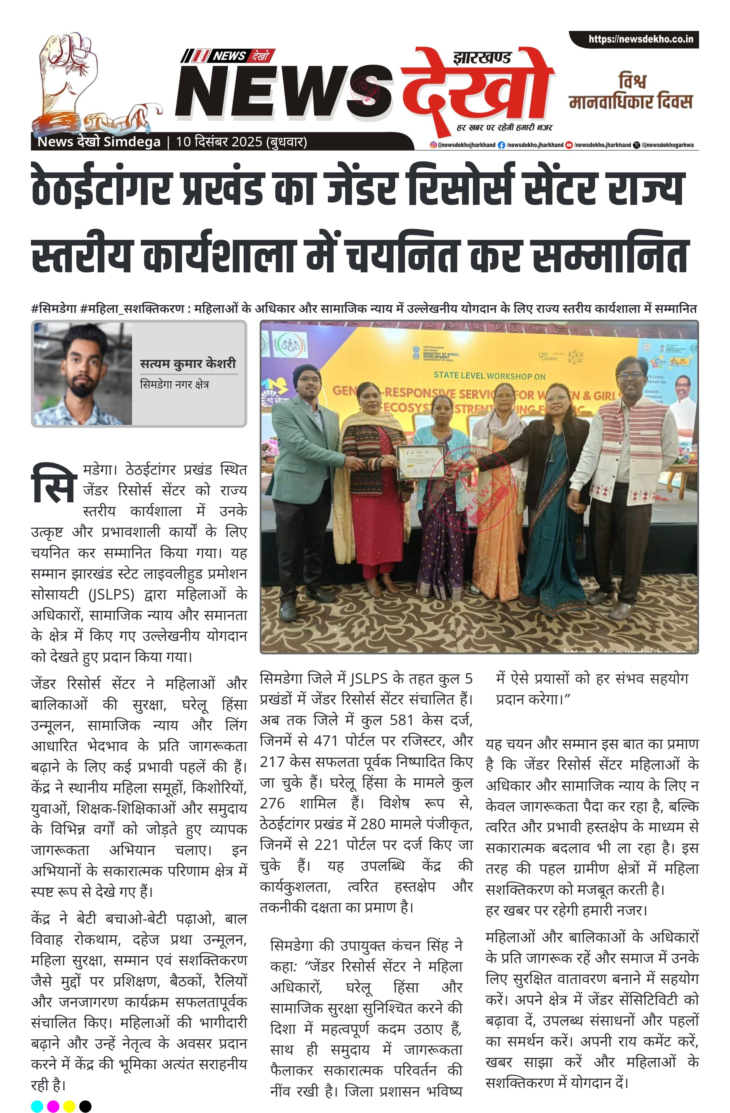 #सिमडेगा #महिला_सशक्तिकरण : महिलाओं के अधिकार और सामाजिक न्याय में उल्लेखनीय योगदान के लिए राज्य स्तरीय कार्यशाला में सम्मानित। ठेठईटांगर प्रखंड का जेंडर रिसोर्स सेंटर राज्य स्तरीय कार्यशाला में चयनित। झारखंड स्टेट लाइवलीहुड प्रमोशन सोसायटी ने महिला अधिकारों और सामाजिक न्याय में योगदान को देखते हुए सम्मानित किया। केंद्र ने बेटी बचाओ-बेटी पढ़ाओ, बाल विवाह रोकथाम, महिला सुरक्षा, दहेज प्रथा उन्मूलन जैसे कार्यक्रम सफलतापूर्वक चलाए। जिले में अब तक 581 केस दर्ज, जिनमें से 471 पोर्टल पर रजिस्टर, और 217…