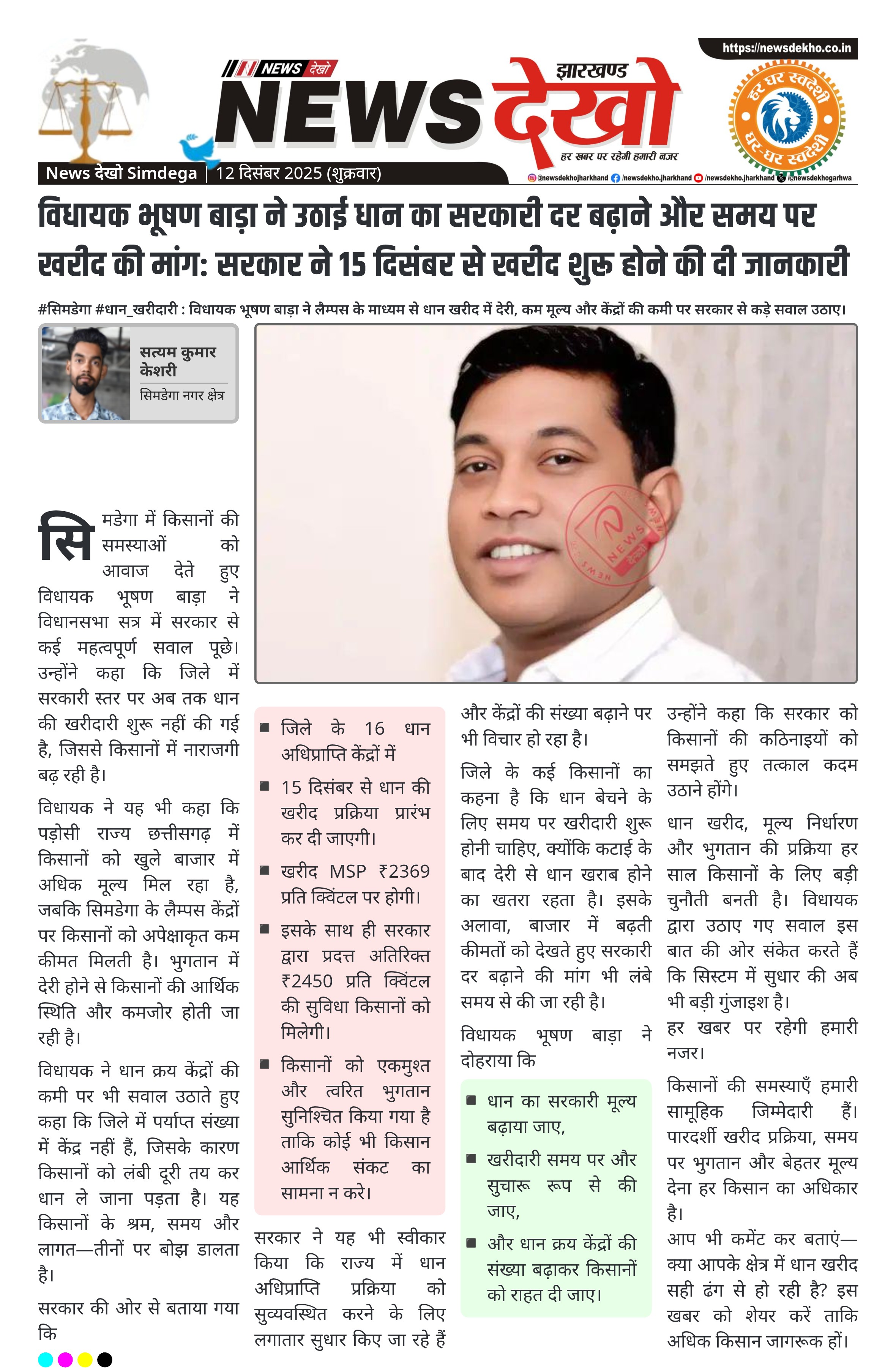 #सिमडेगा #धान_खरीदारी : विधायक भूषण बाड़ा ने लैम्पस के माध्यम से धान खरीद में देरी, कम मूल्य और केंद्रों की कमी पर सरकार से कड़े सवाल उठाए। विधायक भूषण बाड़ा ने विधानसभा में धान खरीद में देरी का मुद्दा जोरदार तरीके से उठाया। कहा— छत्तीसगढ़ में अधिक मूल्य, लेकिन जिले के लैम्पस में किसानों को कम दर और देर से भुगतान। धान क्रय केंद्रों की कमी से किसानों को भारी परेशानी। सरकार ने बताया— 15 दिसंबर से 16 केंद्रों पर…