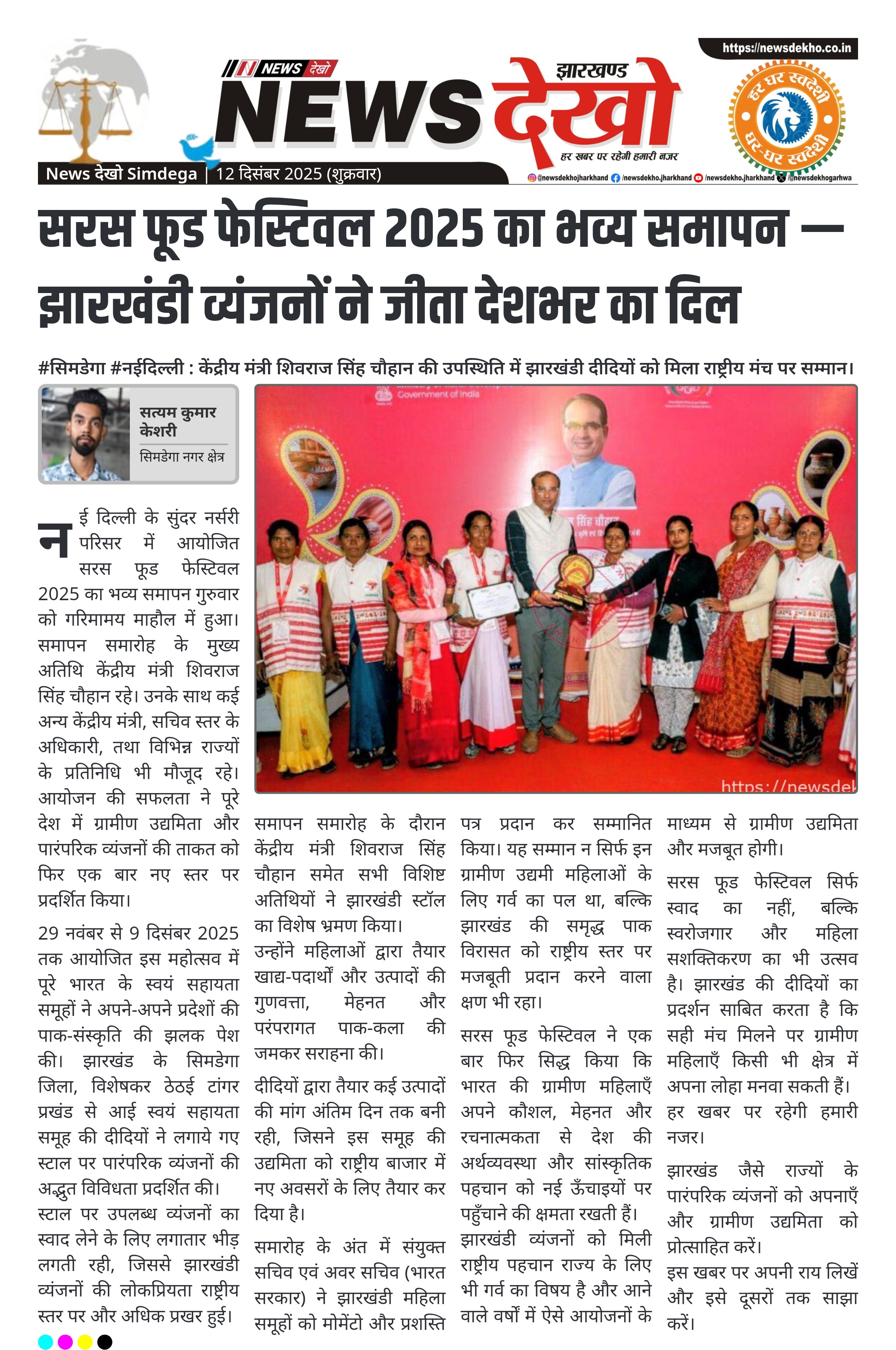 #सिमडेगा #नईदिल्ली : केंद्रीय मंत्री शिवराज सिंह चौहान की उपस्थिति में झारखंडी दीदियों को मिला राष्ट्रीय मंच पर सम्मान। सरस फूड फेस्टिवल 2025 का हुआ भव्य समापन। केंद्रीय मंत्री शिवराज सिंह चौहान रहे मुख्य अतिथि। 29 नवंबर–9 दिसंबर तक चला यह बड़ा राष्ट्रीय आयोजन। सिमडेगा की दीदियों ने झारखंडी व्यंजनों से आगंतुकों का मन जीता। दीदियों को मोमेंटो व प्रशस्ति पत्र देकर किया गया सम्मानित। नई दिल्ली के सुंदर नर्सरी परिसर में आयोजित सरस फूड फेस्टिवल 2025 का भव्य समापन…