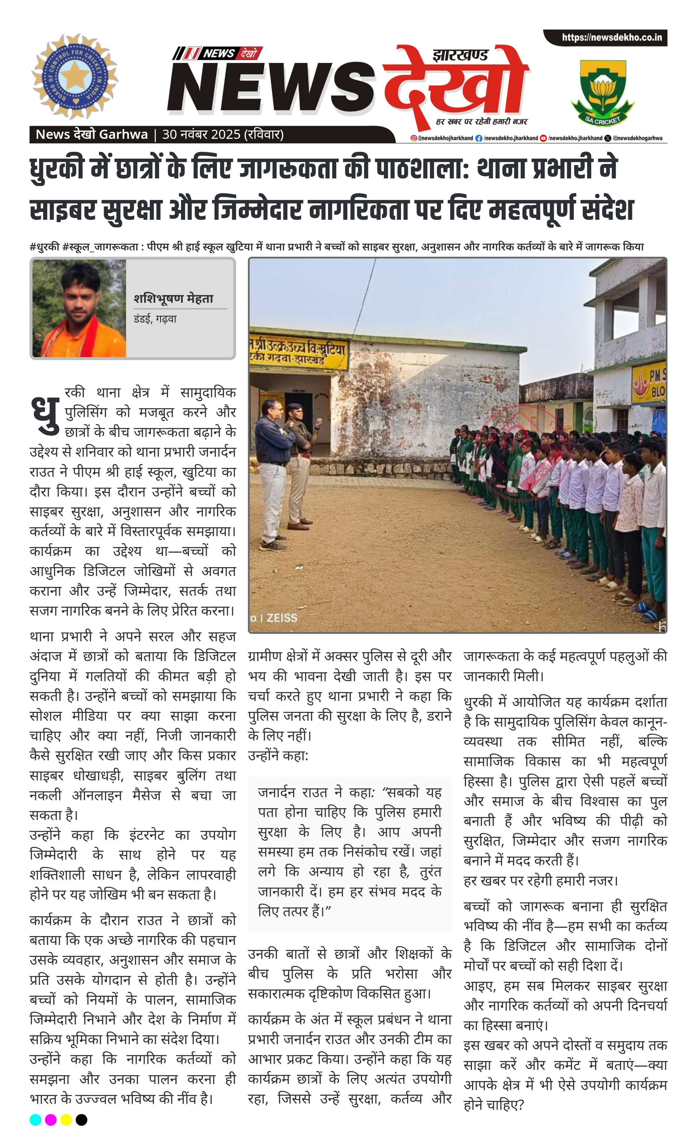#धुरकी #स्कूल_जागरूकता : पीएम श्री हाई स्कूल खुटिया में थाना प्रभारी ने बच्चों को साइबर सुरक्षा, अनुशासन और नागरिक कर्तव्यों के बारे में जागरूक किया थाना प्रभारी जनार्दन राउत ने पीएम श्री हाई स्कूल, खुटिया में जागरूकता कार्यक्रम संचालित किया। छात्रों को साइबर सुरक्षा, ऑनलाइन सतर्कता और साइबर अपराधों से बचाव की विस्तृत जानकारी दी गई। बच्चों को जिम्मेदार नागरिकता, अनुशासन और कानूनपालन के महत्व से अवगत कराया गया। पुलिस और जनता के बीच भय नहीं, विश्वास का संबंध बनाने…