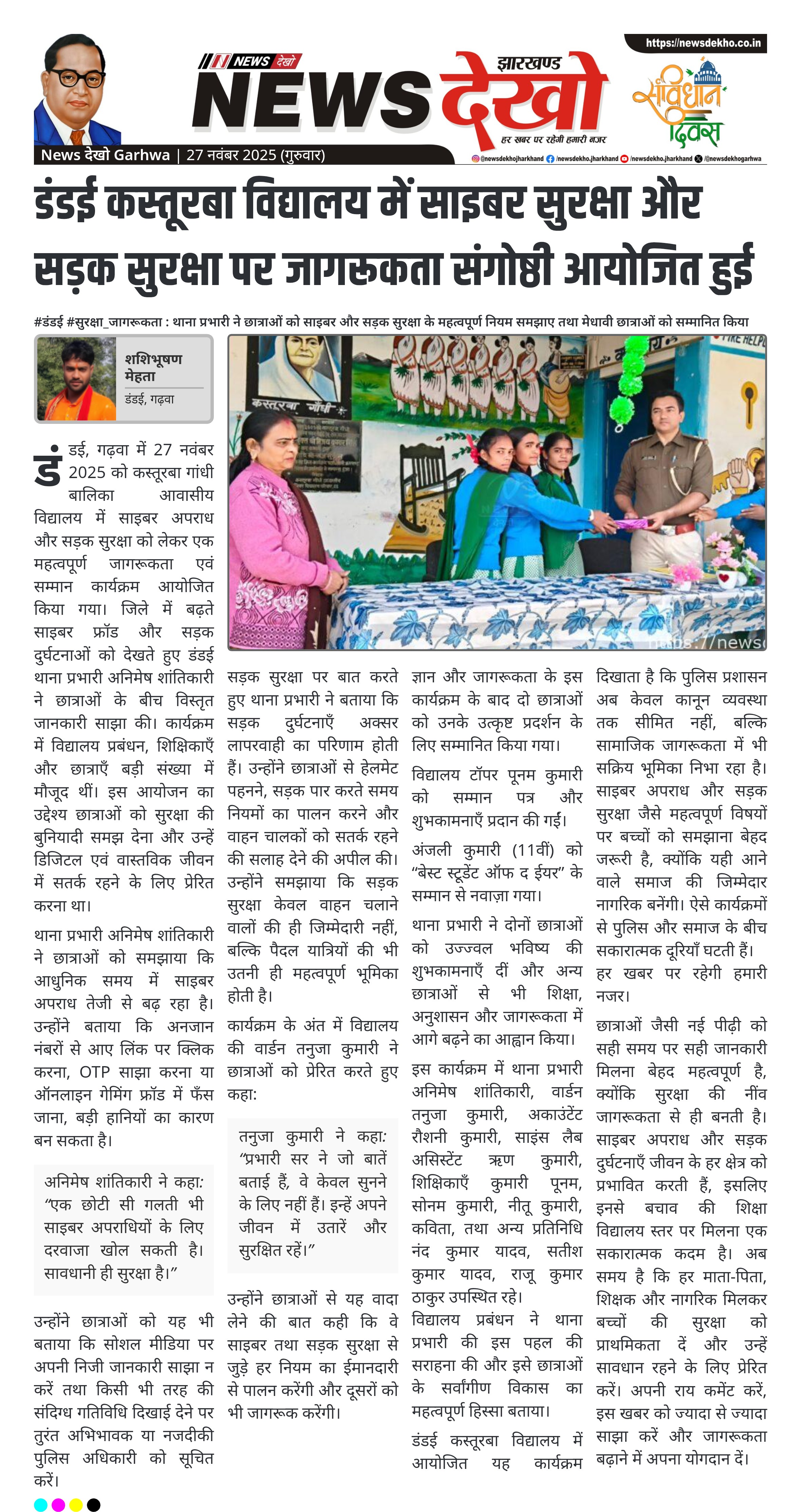 #डंडई #सुरक्षा_जागरूकता : थाना प्रभारी ने छात्राओं को साइबर और सड़क सुरक्षा के महत्वपूर्ण नियम समझाए तथा मेधावी छात्राओं को सम्मानित किया डंडई थाना प्रभारी अनिमेष शांतिकारी ने कस्तूरबा विद्यालय में विस्तृत जागरूकता कार्यक्रम किया। छात्राओं को साइबर सुरक्षा, OTP fraud, ऑनलाइन लिंक, और रोड सेफ्टी नियमों पर मार्गदर्शन दिया। वार्डन तनुजा कुमारी ने छात्राओं से सुरक्षा सीखों को जीवन में अपनाने का आग्रह किया। कार्यक्रम में मेधावी छात्राओं पूनम कुमारी और अंजली कुमारी को सम्मानित किया गया। विद्यालय टीम…