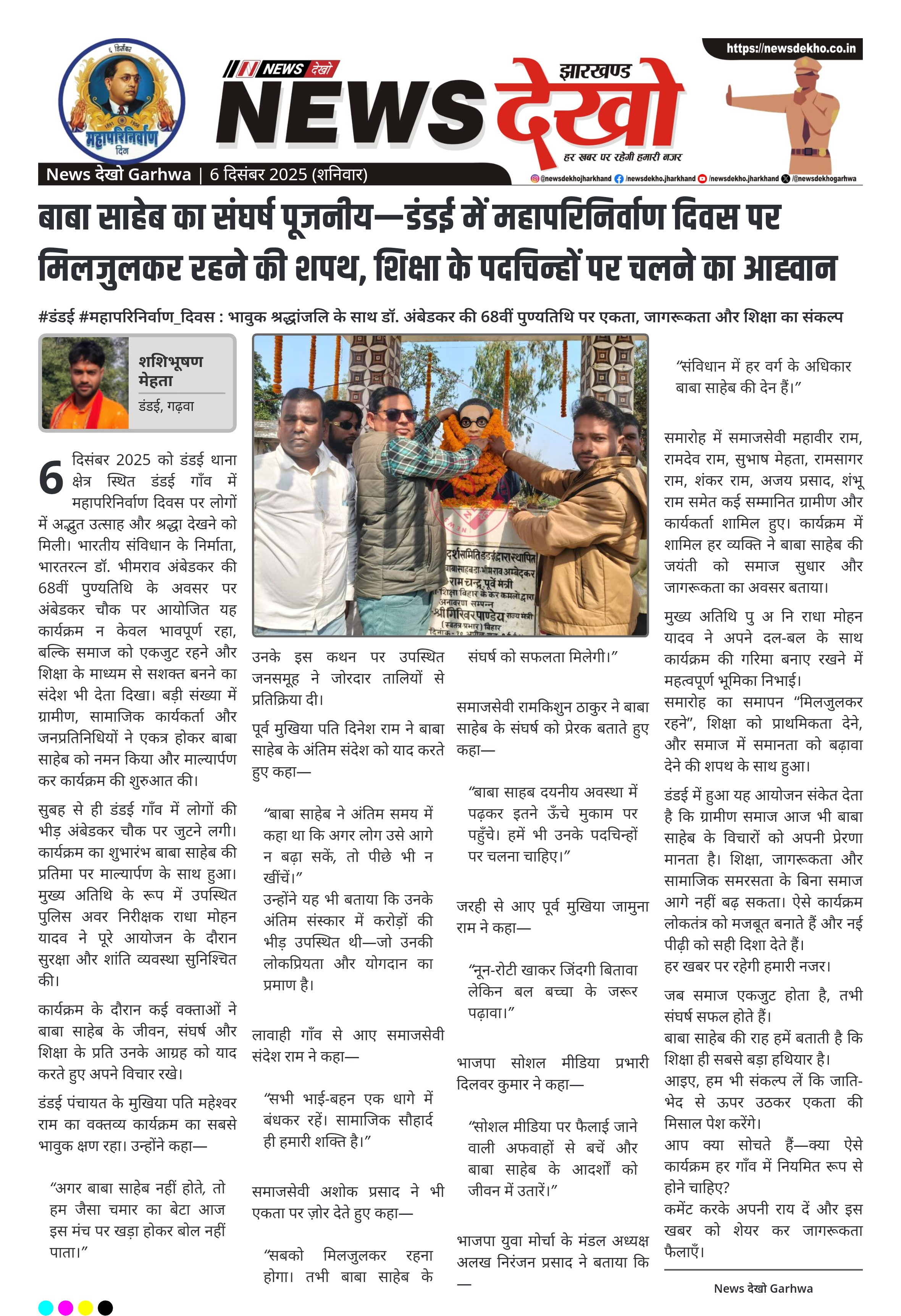 #डंडई #महापरिनिर्वाण_दिवस : भावुक श्रद्धांजलि के साथ डॉ. अंबेडकर की 68वीं पुण्यतिथि पर एकता, जागरूकता और शिक्षा का संकल्प डंडई गाँव के अंबेडकर चौक पर डॉ. भीमराव अंबेडकर की 68वीं पुण्यतिथि धूमधाम से मनाई गई। कार्यक्रम के मुख्य अतिथि पु अ नि राधा मोहन यादव रहे, जिन्होंने व्यवस्था संभाली। बड़ी संख्या में ग्रामीणों और गणमान्यों ने माल्यार्पण कर श्रद्धांजलि दी। वक्ताओं ने एकता, शिक्षा, और सामाजिक सौहार्द को आगे बढ़ाने का आह्वान किया। कई वक्ताओं ने कहा—“बाबा साहेब नहीं होते,…