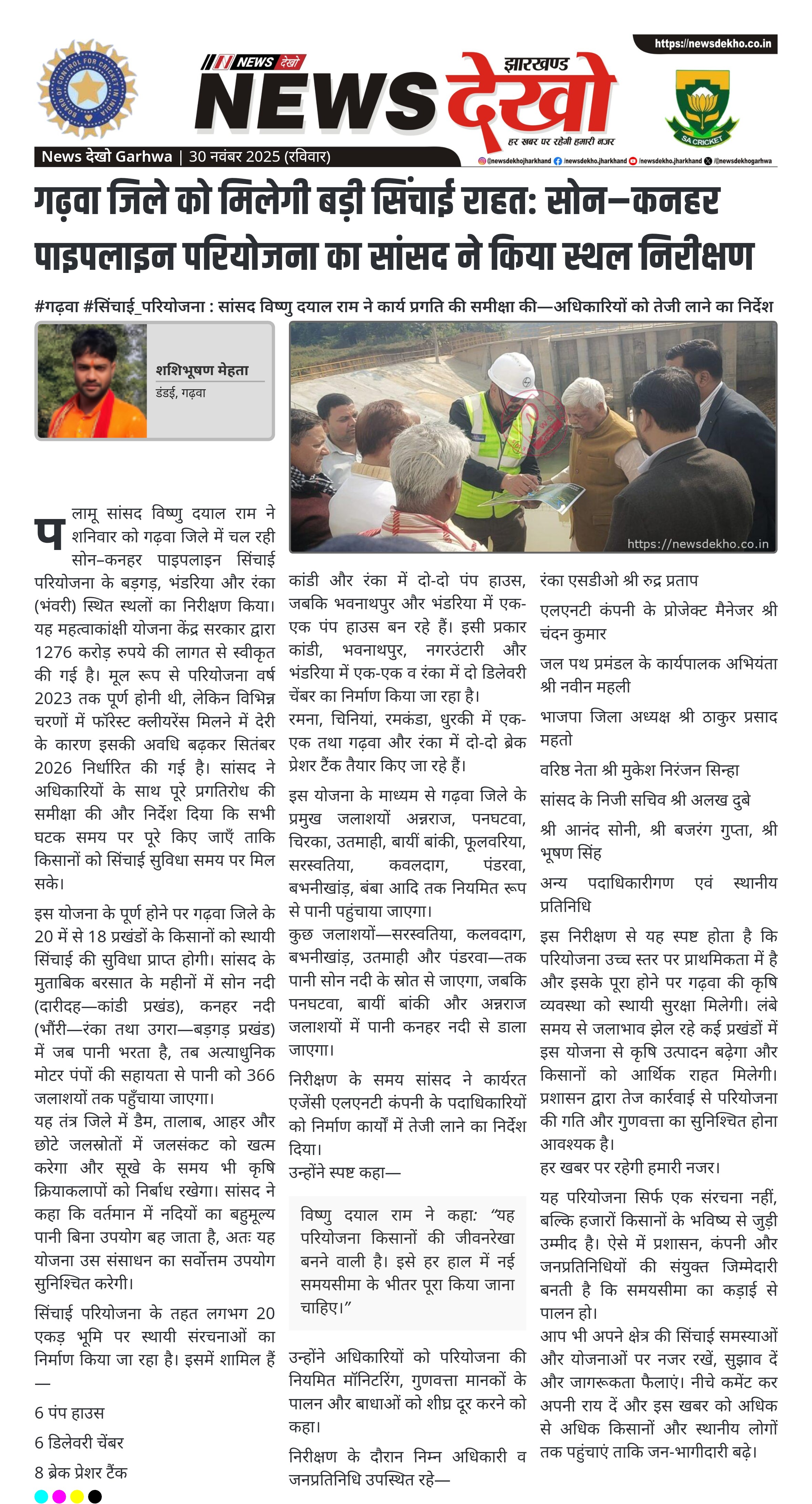 गढ़वा जिले को मिलेगी बड़ी सिंचाई राहत: सोन–कनहर पाइपलाइन परियोजना का सांसद ने किया स्थल निरीक्षण