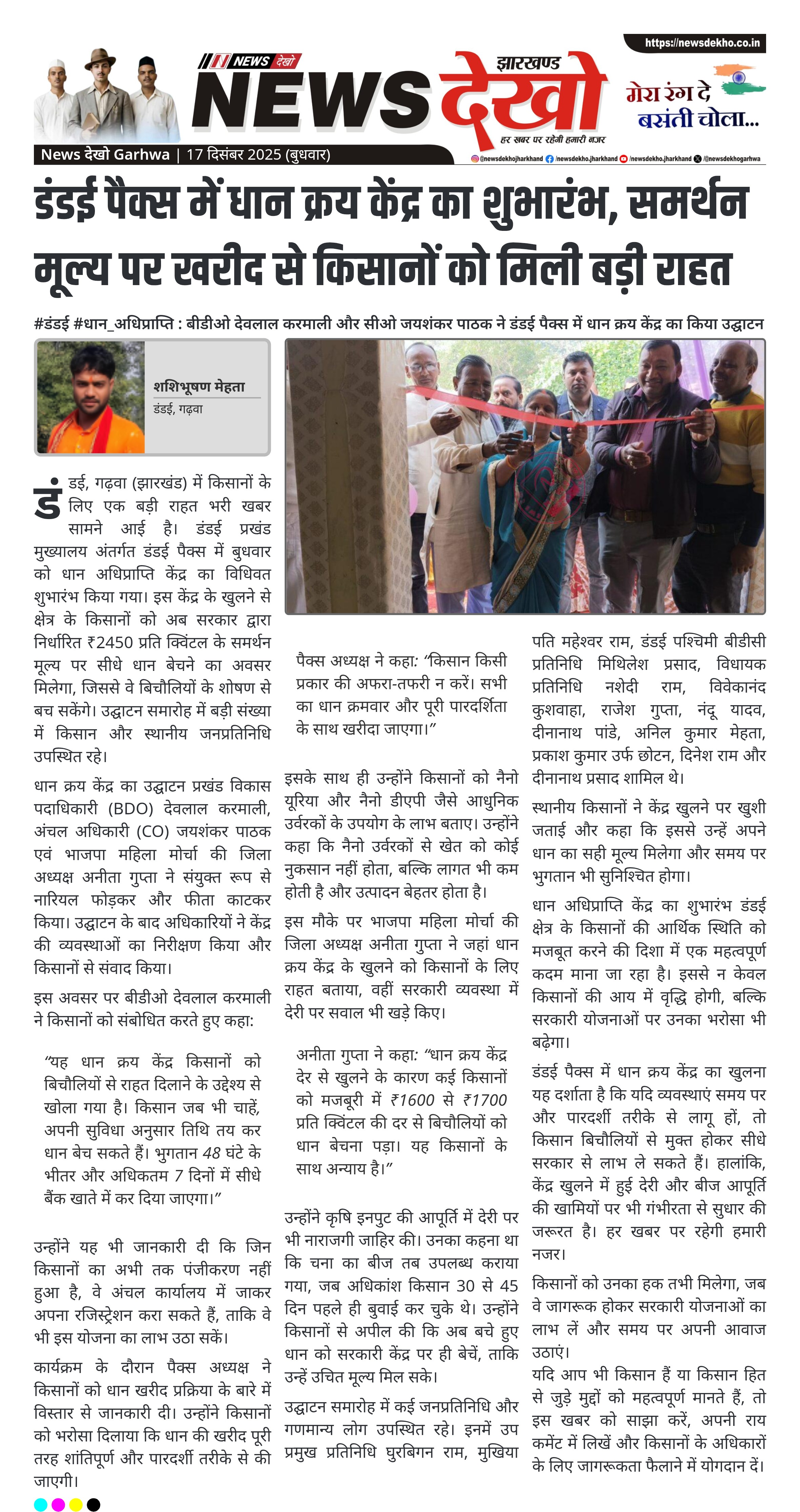 #डंडई #धान_अधिप्राप्ति : बीडीओ देवलाल करमाली और सीओ जयशंकर पाठक ने डंडई पैक्स में धान क्रय केंद्र का किया उद्घाटन डंडई प्रखंड के डंडई पैक्स में धान अधिप्राप्ति केंद्र का विधिवत शुभारंभ। ₹2450 प्रति क्विंटल समर्थन मूल्य पर किसानों से सीधे धान की खरीद। बीडीओ देवलाल करमाली, सीओ जयशंकर पाठक और अनीता गुप्ता ने संयुक्त रूप से किया उद्घाटन। किसानों को 48 घंटे से 7 दिन के भीतर भुगतान सीधे बैंक खाते में मिलने का आश्वासन। पैक्स अध्यक्ष ने नैनो…
