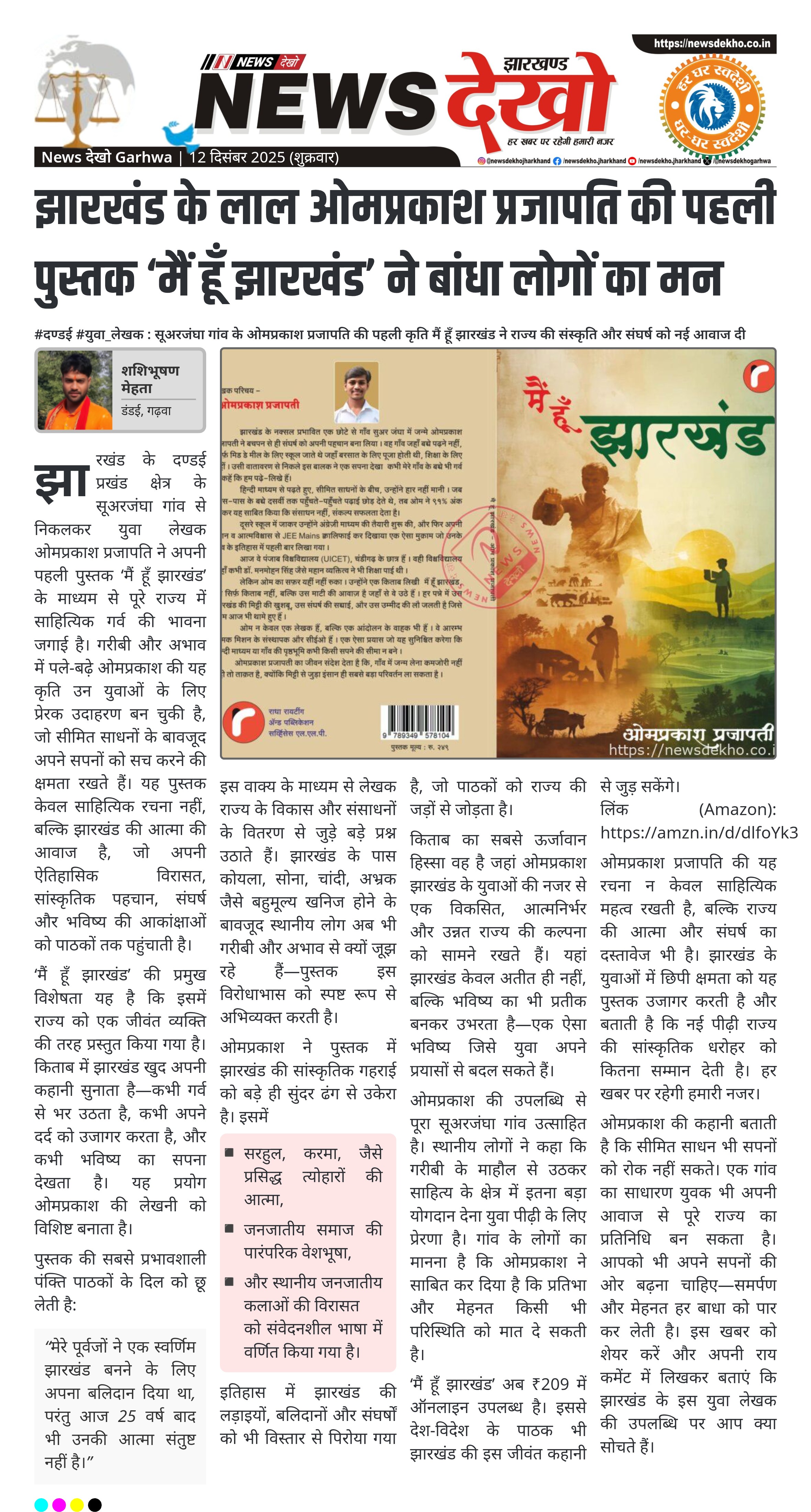 #डंडई #युवा_लेखक : सूअरजंघा गांव के ओमप्रकाश प्रजापति की पहली कृति मैं हूँ झारखंड ने राज्य की संस्कृति और संघर्ष को नई आवाज दी सूअरजंघा गांव, दण्डई प्रखंड के युवक ओमप्रकाश प्रजापति की पहली पुस्तक प्रकाशित। गरीबी में जन्मे ओमप्रकाश आज बन रहे हैं युवा प्रेरणा। ‘मैं हूँ झारखंड’ में राज्य को सजीव व्यक्तित्व की तरह प्रस्तुत किया गया है। पुस्तक में इतिहास, संस्कृति, पीड़ा और भविष्य का भावनात्मक चित्रण। अब Amazon पर उपलब्ध, कीमत ₹209। गढ़वा जिले के dandai…