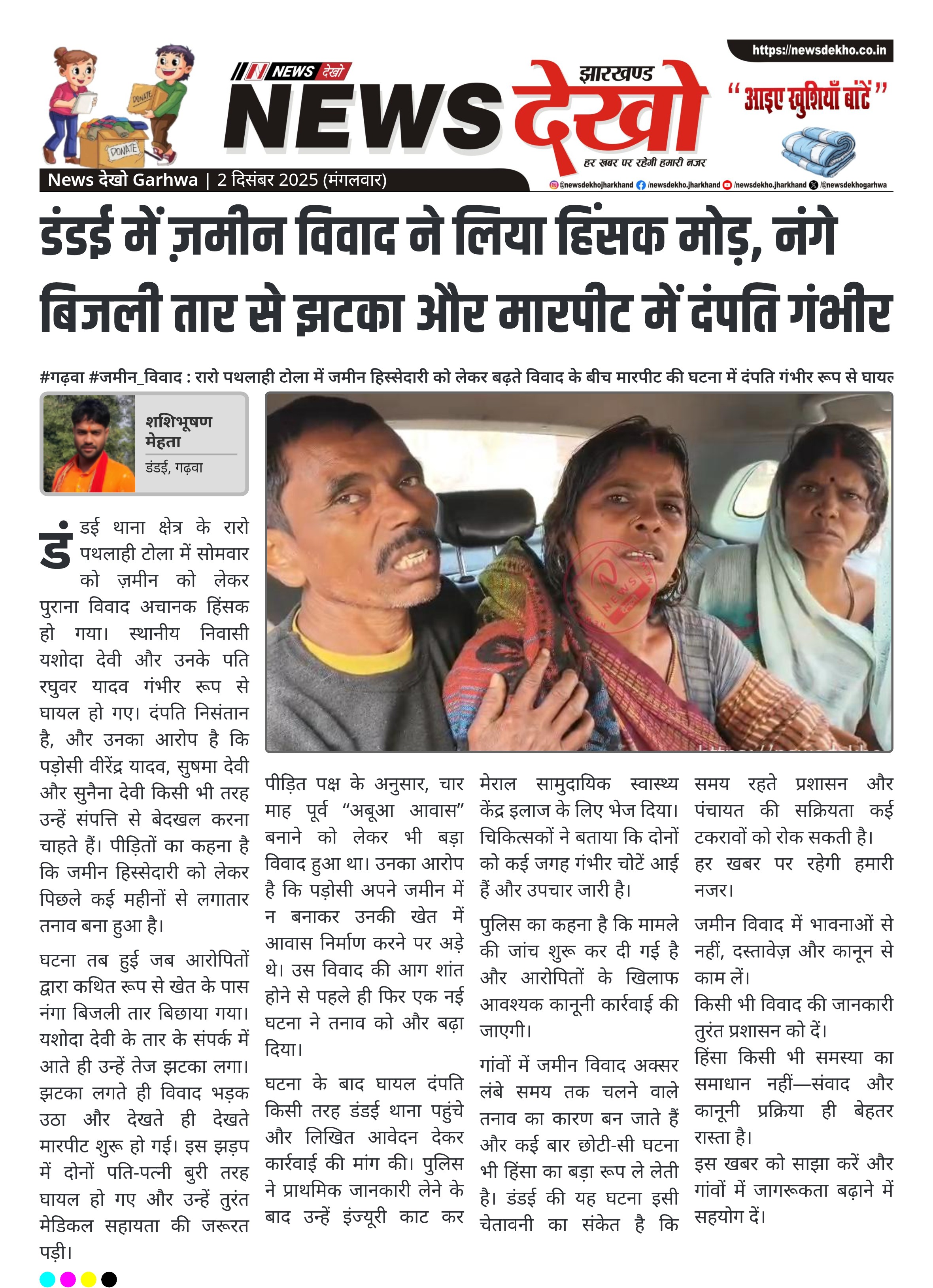 #गढ़वा #जमीन_विवाद : रारो पथलाही टोला में जमीन हिस्सेदारी को लेकर बढ़ते विवाद के बीच मारपीट की घटना में दंपति गंभीर रूप से घायल। डंडई, गढ़वा के रारो पथलाही टोला में जमीन विवाद से बढ़ा तनाव। यशोदा देवी और रघुवर यादव गंभीर रूप से घायल। आरोप—वीरेंद्र यादव, सुषमा देवी, सुनैना देवी जमीन हड़पने की नीयत से विवाद बढ़ा रहे थे। 4 माह पहले अबूआ आवास निर्माण को लेकर भी बड़ा झगड़ा हुआ था। कल नंगे बिजली तार से यशोदा देवी…