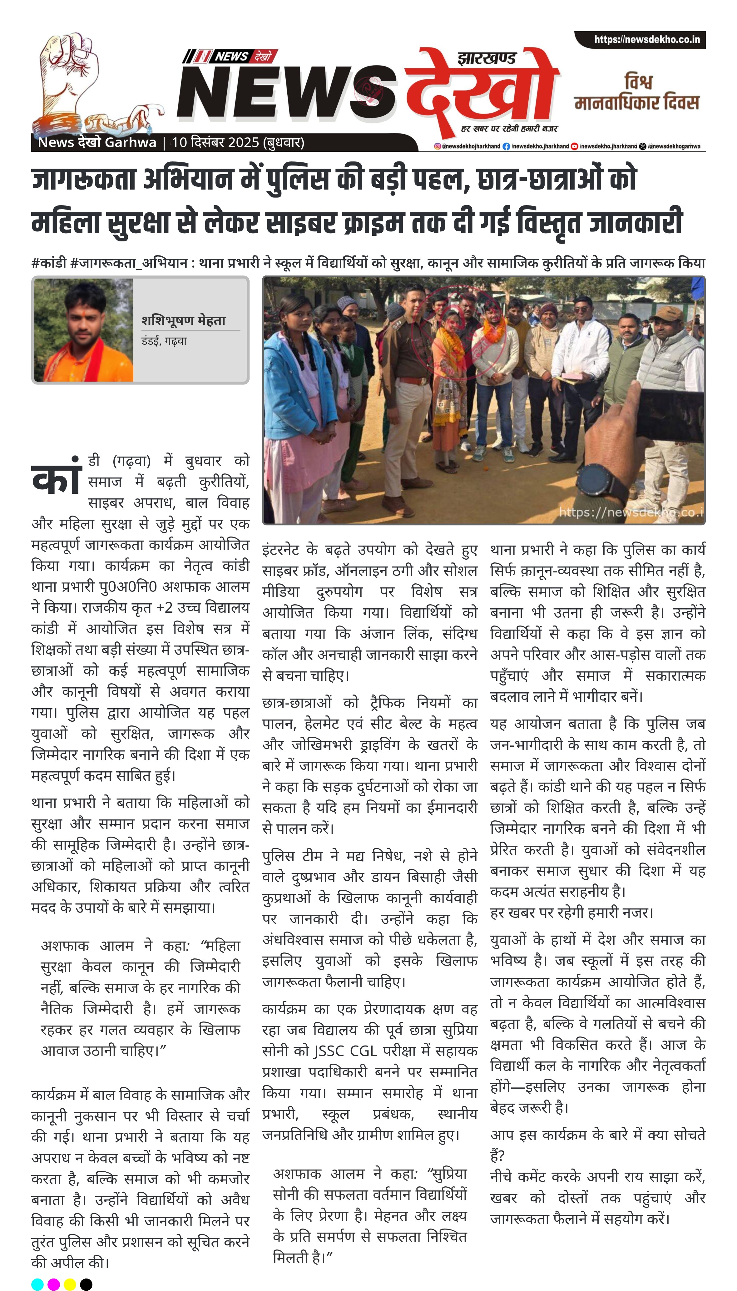 #कांडी #जागरूकता_अभियान : थाना प्रभारी ने स्कूल में विद्यार्थियों को सुरक्षा, कानून और सामाजिक कुरीतियों के प्रति जागरूक किया। कांडी थाना प्रभारी अशफाक आलम के नेतृत्व में जागरूकता कार्यक्रम आयोजित हुआ। राजकीय कृत +2 उच्च विद्यालय कांडी के छात्र-छात्राओं को कई महत्वपूर्ण विषयों पर जानकारी दी गई। महिला सुरक्षा, साइबर क्राइम, बाल विवाह और कुरीतियों पर विस्तृत जागरूकता दी गई। कार्यक्रम में पूर्व छात्रा सुप्रिया सोनी को JSSC CGL में सफलता पर सम्मानित किया गया। पुलिस ने युवाओं से समाज…