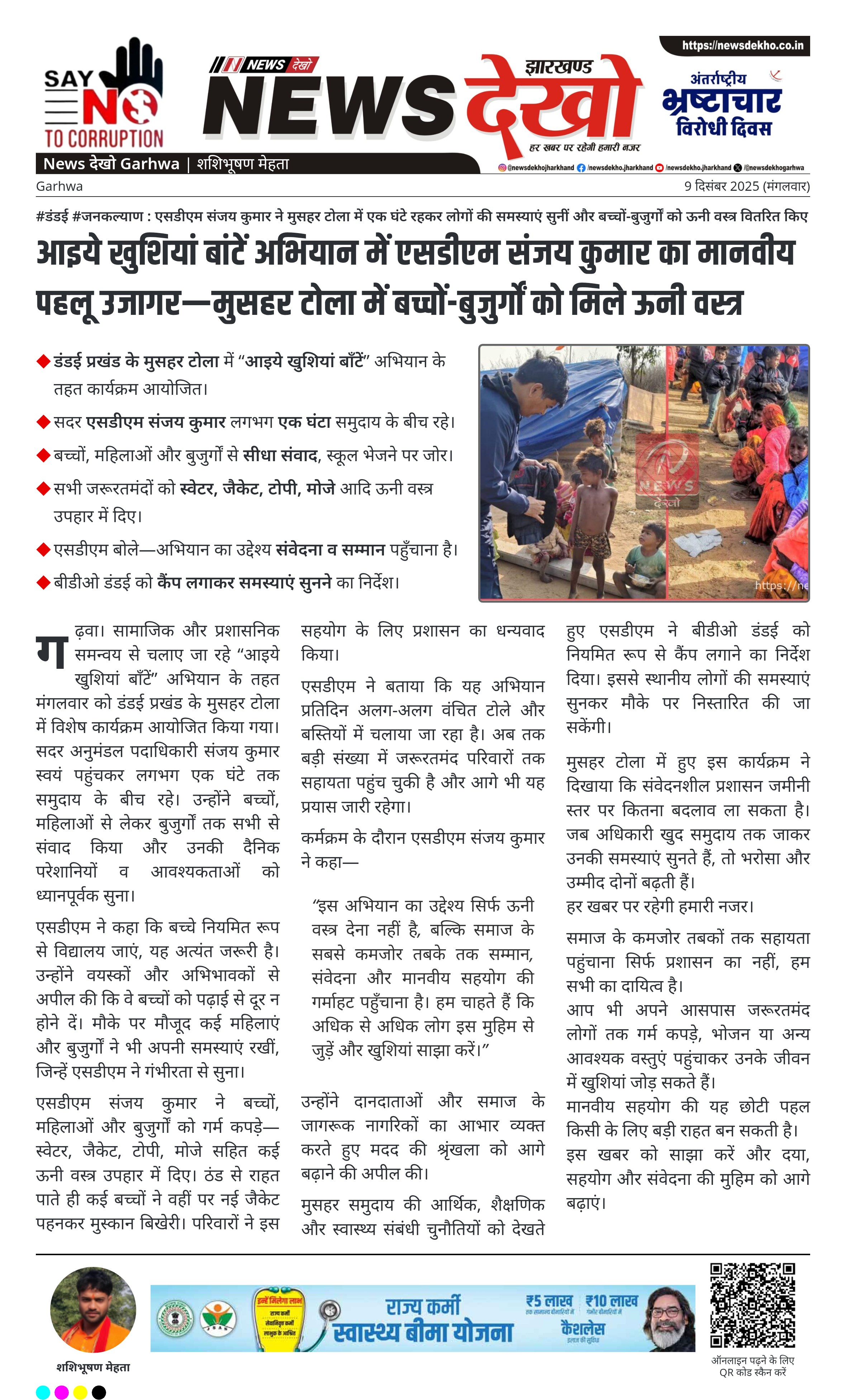 #डंडई #जनकल्याण : एसडीएम संजय कुमार ने मुसहर टोला में एक घंटे रहकर लोगों की समस्याएं सुनीं और बच्चों-बुजुर्गों को ऊनी वस्त्र वितरित किए डंडई प्रखंड के मुसहर टोला में “आइये खुशियां बाँटें” अभियान के तहत कार्यक्रम आयोजित। सदर एसडीएम संजय कुमार लगभग एक घंटा समुदाय के बीच रहे। बच्चों, महिलाओं और बुजुर्गों से सीधा संवाद, स्कूल भेजने पर जोर। सभी जरूरतमंदों को स्वेटर, जैकेट, टोपी, मोजे आदि ऊनी वस्त्र उपहार में दिए। एसडीएम बोले—अभियान का उद्देश्य संवेदना व सम्मान…