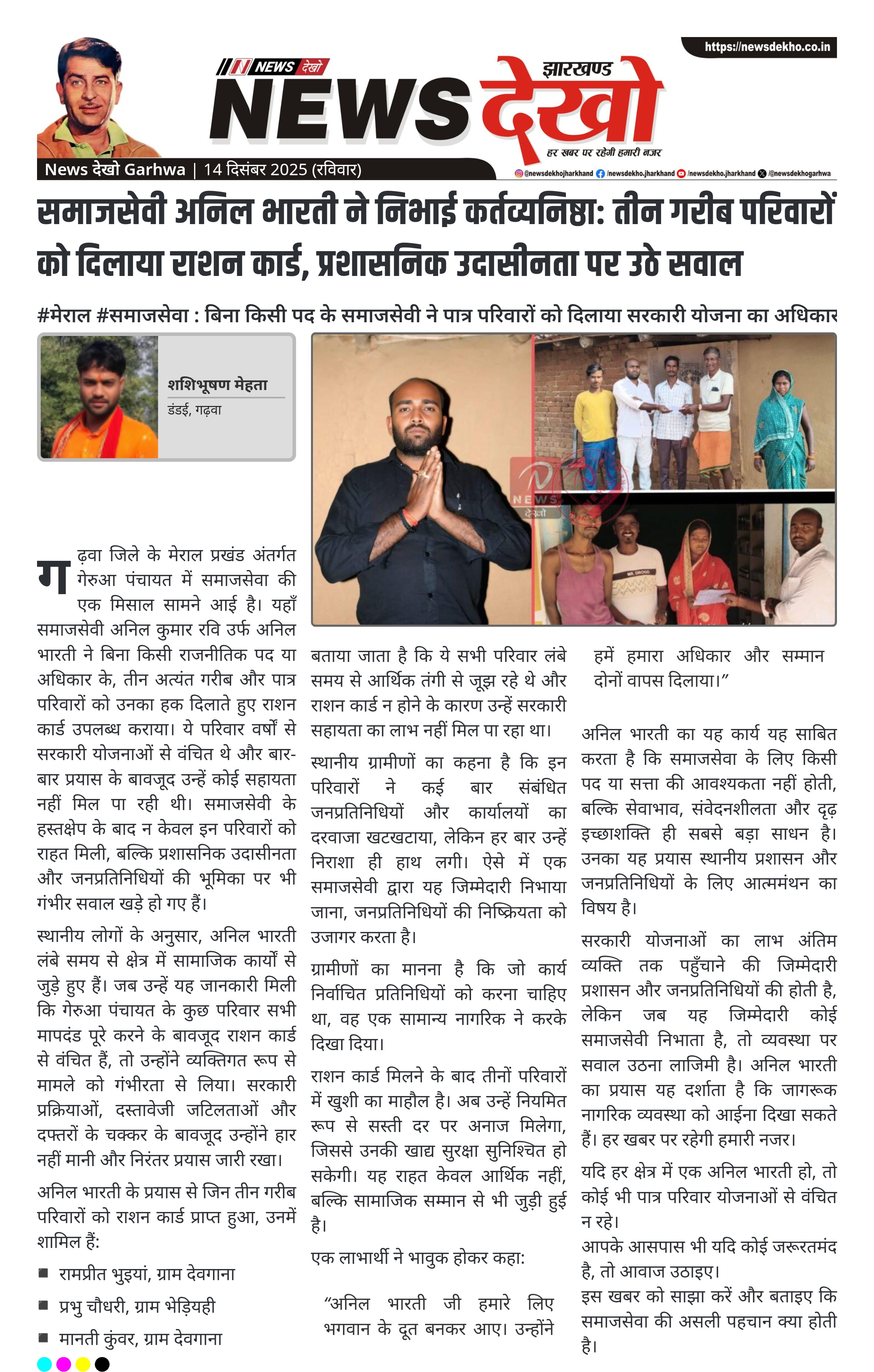 समाजसेवी अनिल भारती ने निभाई कर्तव्यनिष्ठा: तीन गरीब परिवारों को दिलाया राशन कार्ड, प्रशासनिक उदासीनता पर उठे सवाल