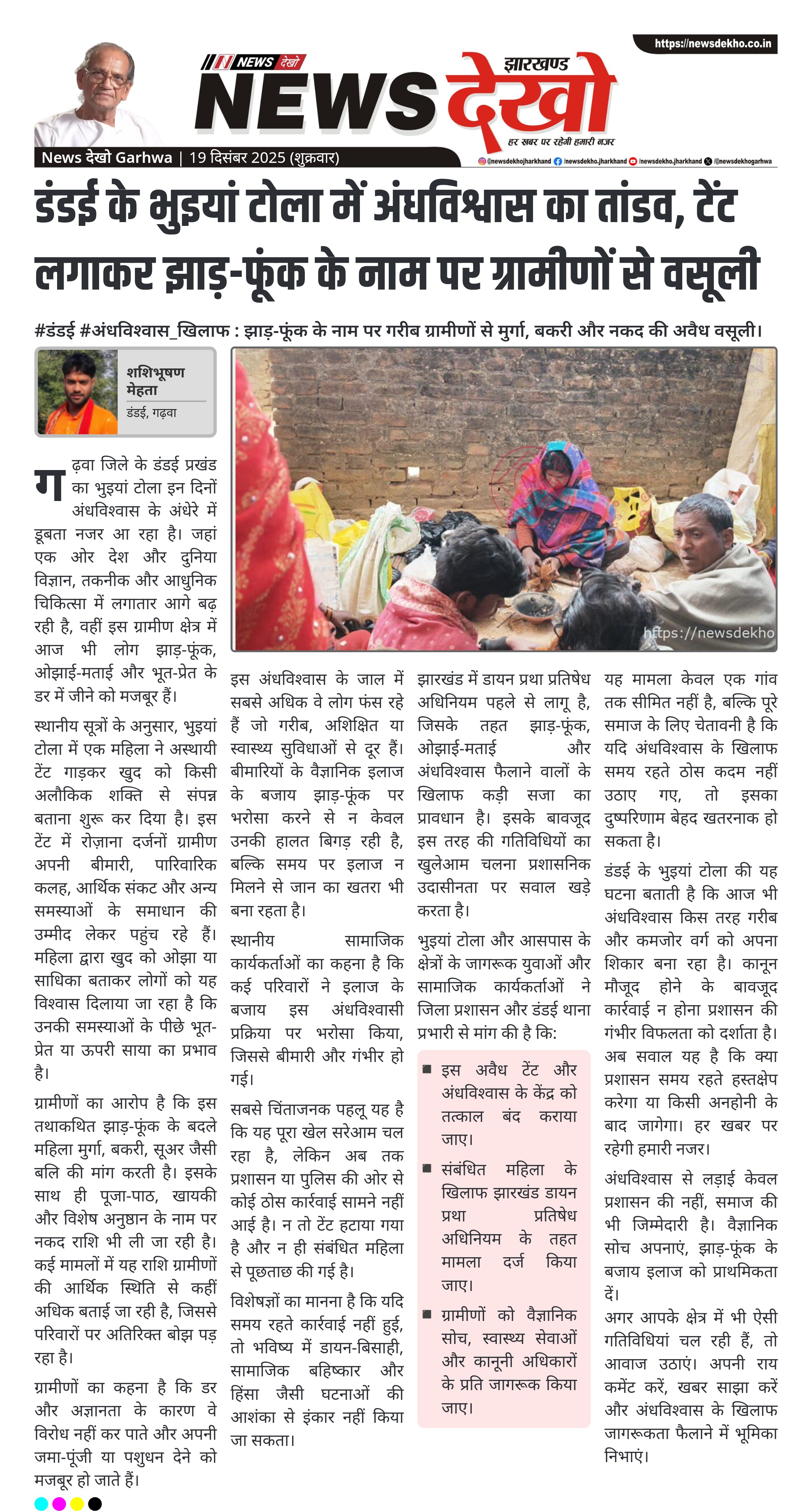 #डंडई #अंधविश्वास_खिलाफ : झाड़-फूंक के नाम पर गरीब ग्रामीणों से मुर्गा, बकरी और नकद की अवैध वसूली। डंडई प्रखंड के भुइयां टोला में अंधविश्वास का खुला खेल। एक महिला द्वारा टेंट लगाकर झाड़-फूंक और ओझाई-मताई का दावा। भूत-प्रेत और ऊपरी साया का डर दिखाकर वसूली के आरोप। ग्रामीणों से मुर्गा, बकरी, सूअर और नकद राशि की मांग। प्रशासनिक कार्रवाई नहीं होने से डायन प्रथा जैसी घटनाओं का खतरा। गढ़वा जिले के डंडई प्रखंड का भुइयां टोला इन दिनों अंधविश्वास के…