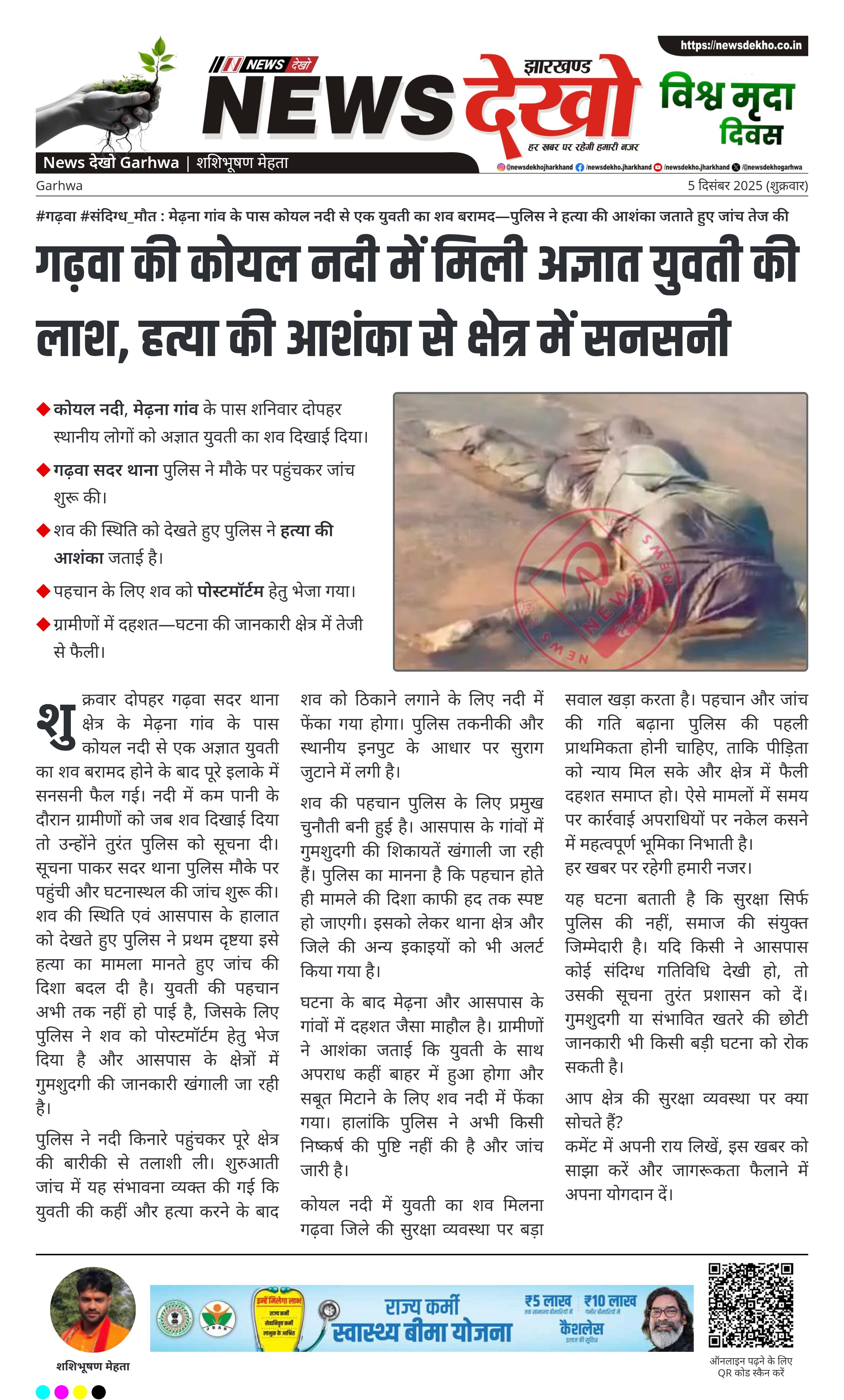 #गढ़वा #संदिग्ध_मौत : मेढ़ना गांव के पास कोयल नदी से एक युवती का शव बरामद—पुलिस ने हत्या की आशंका जताते हुए जांच तेज की कोयल नदी, मेढ़ना गांव के पास शनिवार दोपहर स्थानीय लोगों को अज्ञात युवती का शव दिखाई दिया। गढ़वा सदर थाना पुलिस ने मौके पर पहुंचकर जांच शुरू की। शव की स्थिति को देखते हुए पुलिस ने हत्या की आशंका जताई है। पहचान के लिए शव को पोस्टमॉर्टम हेतु भेजा गया। ग्रामीणों में दहशत—घटना की जानकारी क्षेत्र…