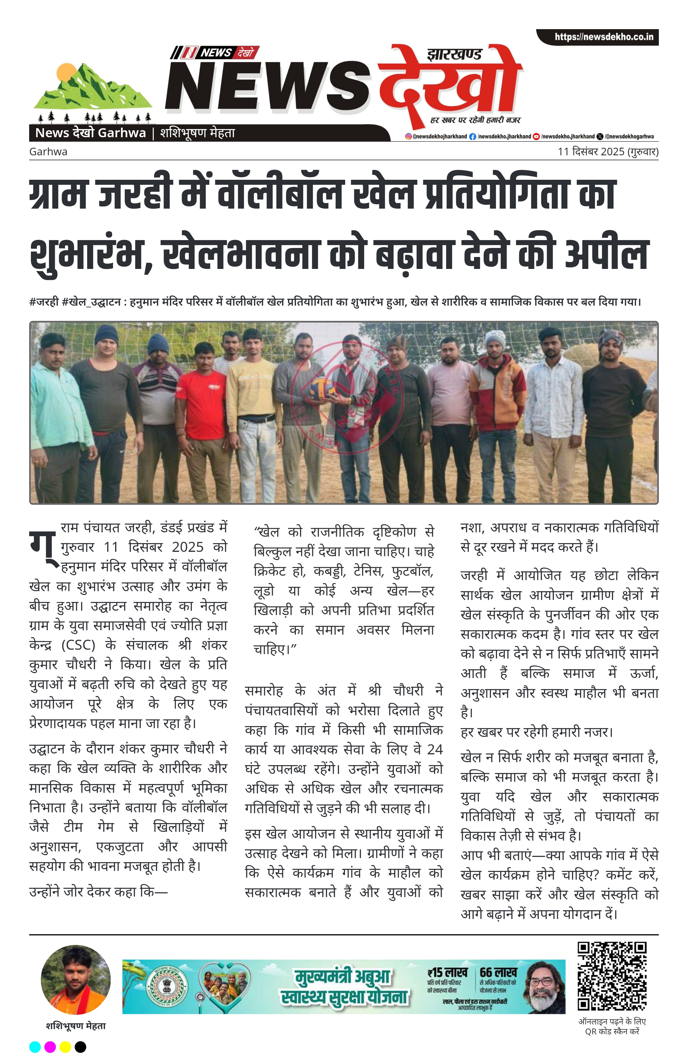 #जरही #खेल_उद्घाटन : हनुमान मंदिर परिसर में वॉलीबॉल खेल प्रतियोगिता का शुभारंभ हुआ, खेल से शारीरिक व सामाजिक विकास पर बल दिया गया। कार्यक्रम का उद्घाटन युवा समाजसेवी शंकर कुमार चौधरी ने किया। आयोजन स्थल: हनुमान मंदिर परिसर, ग्राम जरही। तारीख: 11 दिसंबर 2025, गुरुवार। खेल को राजनीति से ऊपर रखने की अपील की गई। सामाजिक और आवश्यक कार्यों हेतु 24 घंटे तत्पर रहने की घोषणा। ग्राम पंचायत जरही, डंडई प्रखंड में गुरुवार 11 दिसंबर 2025 को हनुमान मंदिर परिसर…