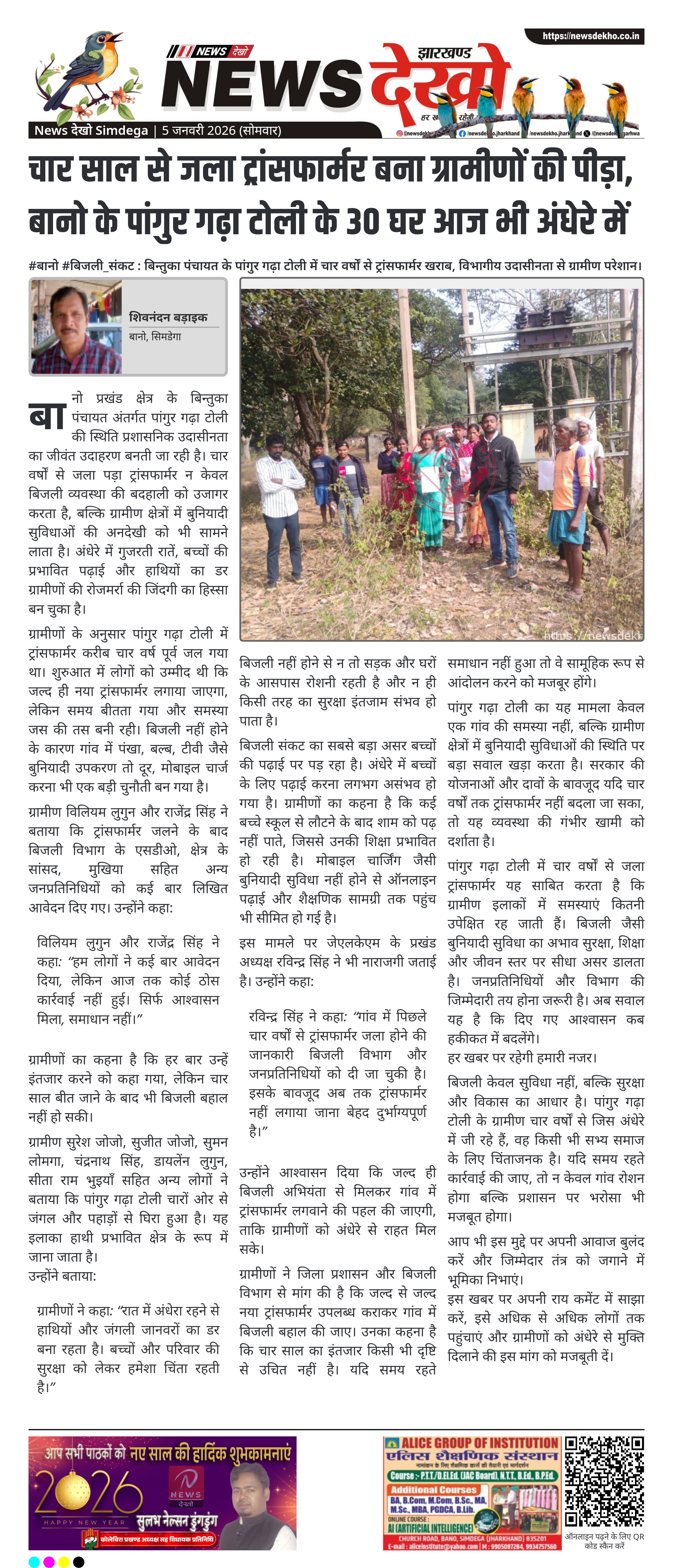 #बानो #बिजली_संकट : बिन्तुका पंचायत के पांगुर गढ़ा टोली में चार वर्षों से ट्रांसफार्मर खराब, विभागीय उदासीनता से ग्रामीण परेशान। पांगुर गढ़ा टोली में पिछले चार वर्षों से जला पड़ा है ट्रांसफार्मर। लगभग 30 घरों के ग्रामीण आज भी बिजली से वंचित। एसडीओ, सांसद, मुखिया सहित कई जनप्रतिनिधियों को दिया गया आवेदन। इलाका हाथी प्रभावित और जंगल-पहाड़ों से घिरा हुआ। बच्चों की पढ़ाई और सुरक्षा पर पड़ रहा सीधा असर। जेएलकेएम प्रखंड अध्यक्ष रविन्द्र सिंह ने हस्तक्षेप का दिया आश्वासन।…