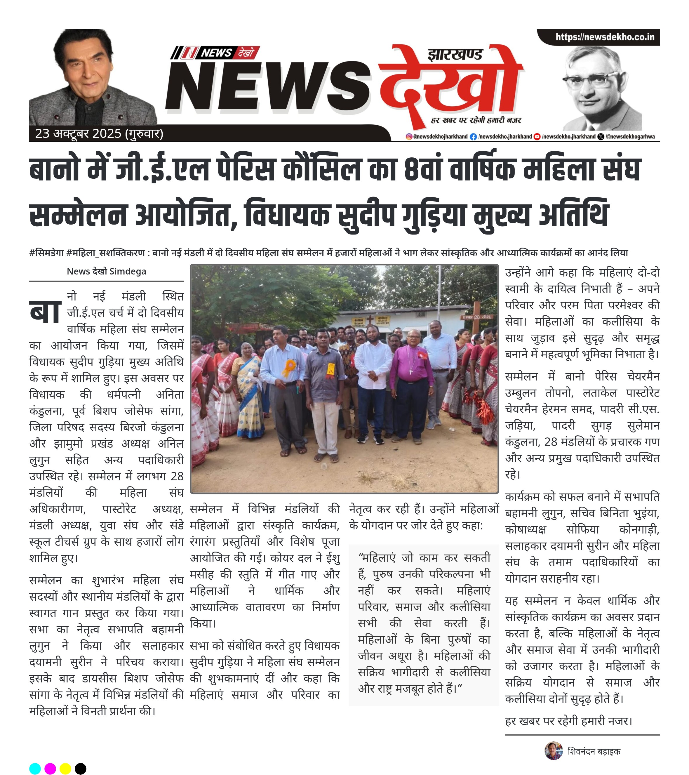 #सिमडेगा #महिला_सशक्तिकरण : बानो नई मंडली में दो दिवसीय महिला संघ सम्मेलन में हजारों महिलाओं ने भाग लेकर सांस्कृतिक और आध्यात्मिक कार्यक्रमों का आनंद लिया तोरपा विधायक सुदीप गुड़िया ने सम्मेलन में बतौर मुख्य अतिथि भाग लिया। दो दिवसीय वार्षिक सम्मेलन 28 मंडलियों की महिलाओं और पदाधिकारियों की उपस्थिति में आयोजित। डायसीस बिशप जोसेफ सांगा और अन्य विशिष्ट अतिथियों ने कार्यक्रम को गौरवान्वित किया। सम्मेलन में महिला संघ सदस्यों द्वारा संस्कृति कार्यक्रम और पूजा का आयोजन किया गया। कार्यक्रम का…
