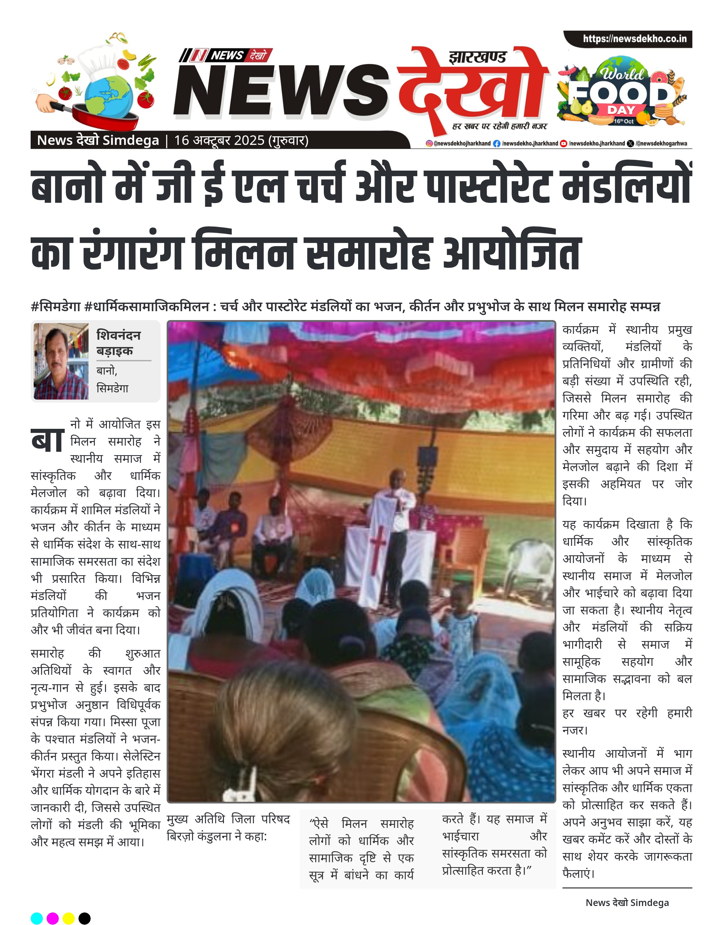 #सिमडेगा #धार्मिकसामाजिकमिलन : चर्च और पास्टोरेट मंडलियों का भजन, कीर्तन और प्रभुभोज के साथ मिलन समारोह सम्पन्न जी ई एल चर्च बानो और पास्टोरेट सिकोरदा व सोयमंडली का संयुक्त मिलन समारोह आयोजित किया गया। कार्यक्रम में सभी अतिथियों को नाच-गाने के साथ मंच तक लाया गया। पादरी उम्बलन तोपनो, पेरिस चेयरमैन बानो, और पादरी हेरमन समद ने प्रभुभोज अनुष्ठान विधिपूर्वक संपन्न किया। सेलेस्टिन भेंगरा मंडली ने अपने इतिहास के बारे में जानकारी दी और विभिन्न मंडलियों द्वारा भजन कीर्तन का…