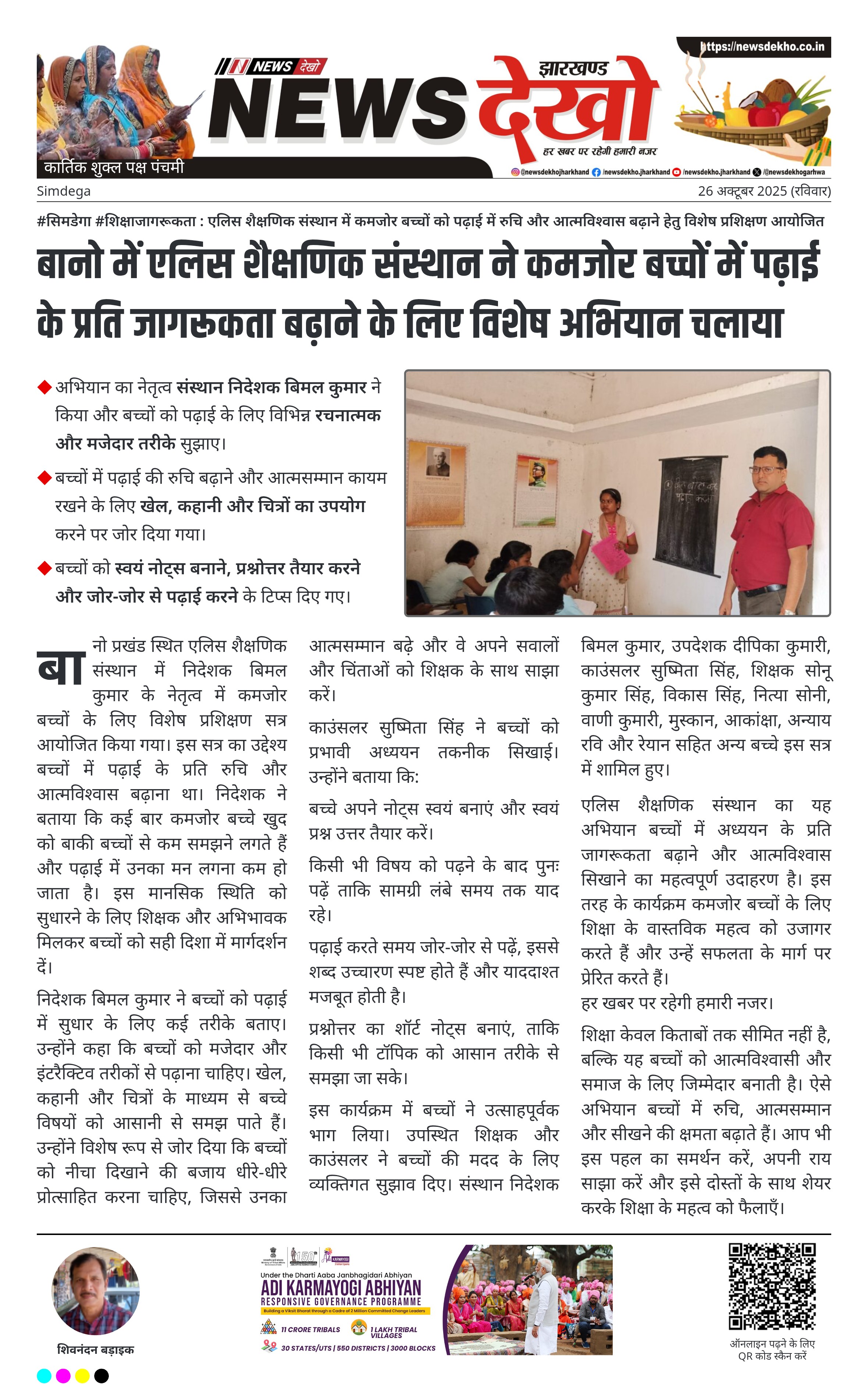 #सिमडेगा #शिक्षाजागरूकता : एलिस शैक्षणिक संस्थान में कमजोर बच्चों को पढ़ाई में रुचि और आत्मविश्वास बढ़ाने हेतु विशेष प्रशिक्षण आयोजित एलिस शैक्षणिक संस्थान, बानो प्रखंड में कमजोर बच्चों को पढ़ाई में सुधार और आत्मविश्वास बढ़ाने के लिए जागरूकता अभियान आयोजित किया गया। अभियान का नेतृत्व संस्थान निदेशक बिमल कुमार ने किया और बच्चों को पढ़ाई के लिए विभिन्न रचनात्मक और मजेदार तरीके सुझाए। बच्चों में पढ़ाई की रुचि बढ़ाने और आत्मसम्मान कायम रखने के लिए खेल, कहानी और चित्रों का…